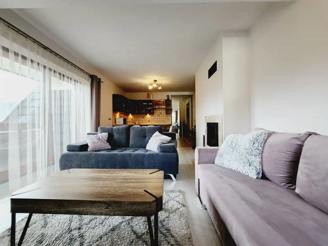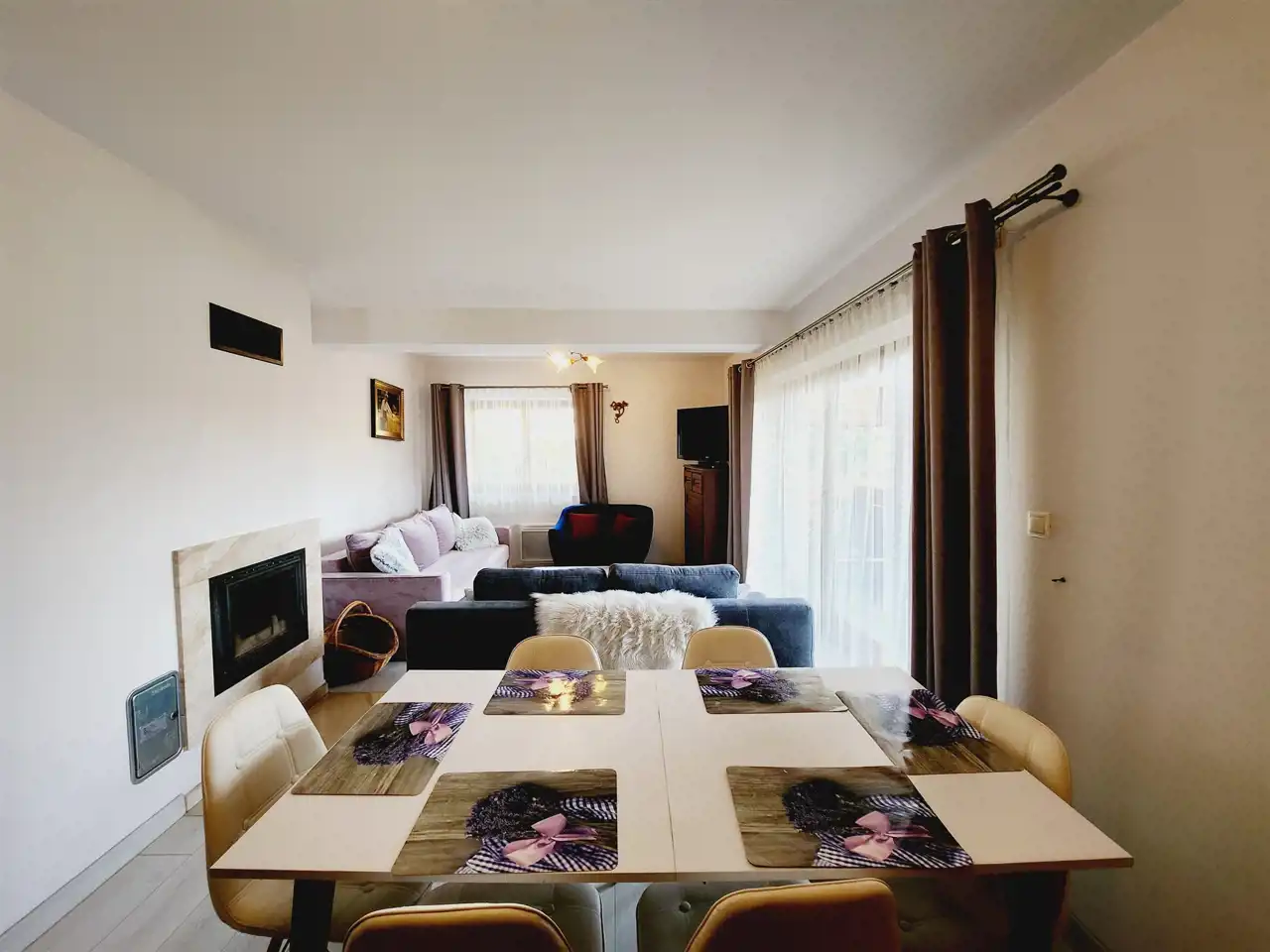przestronny salon z kominkiem i wyjściem na balkon z widokiem na góry,