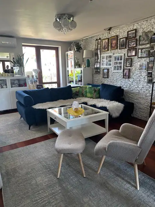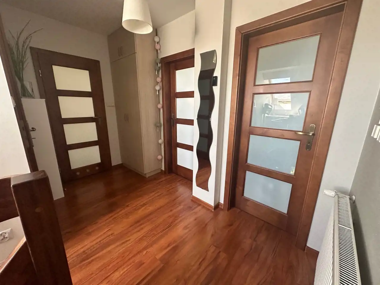 Mieszkanie starannie wykończone, na ścianach gładzie, w salonie łupki dekoracyjne, na podłogach drewno, schody z drzewa egzotycznego. Kuchnia drewniana z wysokiej klasy sprzętem (płyta indukcyjna Elektrolux , zmywarka Elektrolux, suszarka Elektrolux, okap, pralka Elektrolux, piekarnik i mikrofalówka w zabudowie Amica), okna PCV, drzwi drewniane, zewn. Gerda.