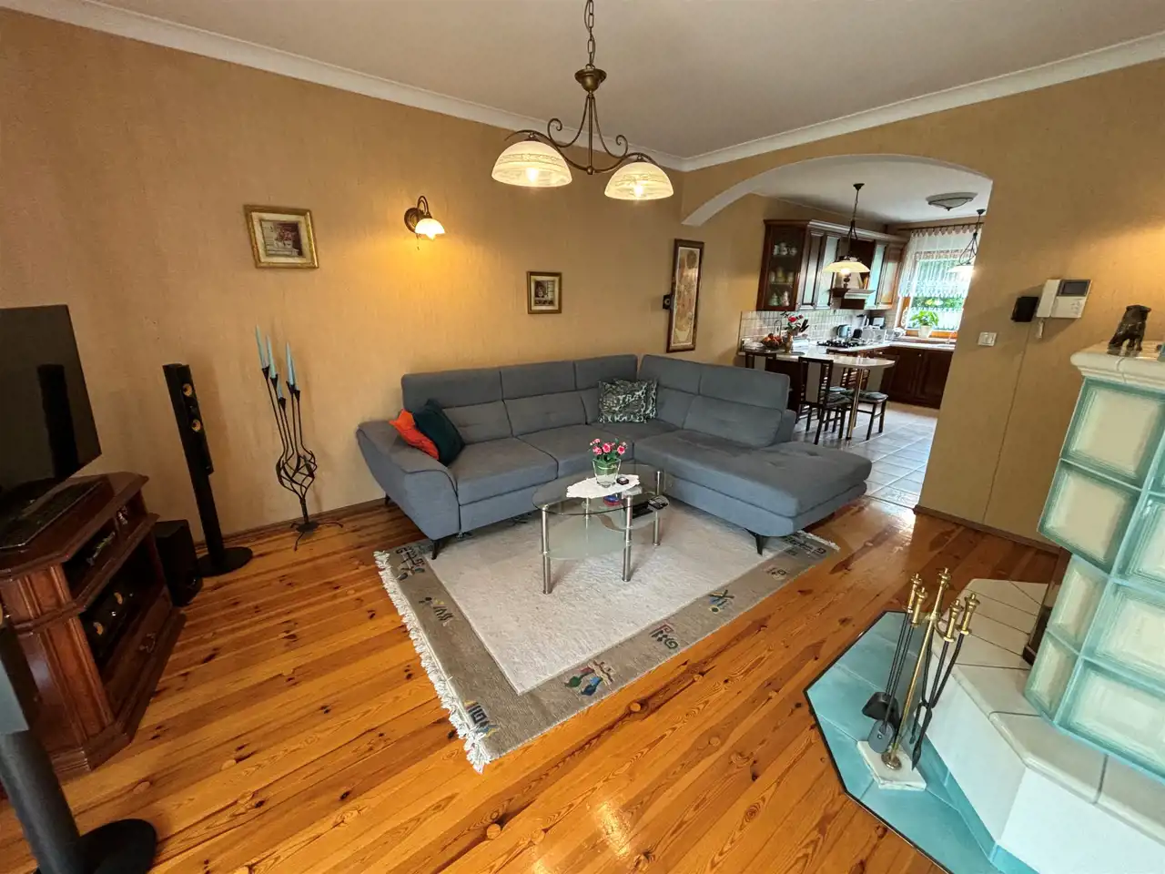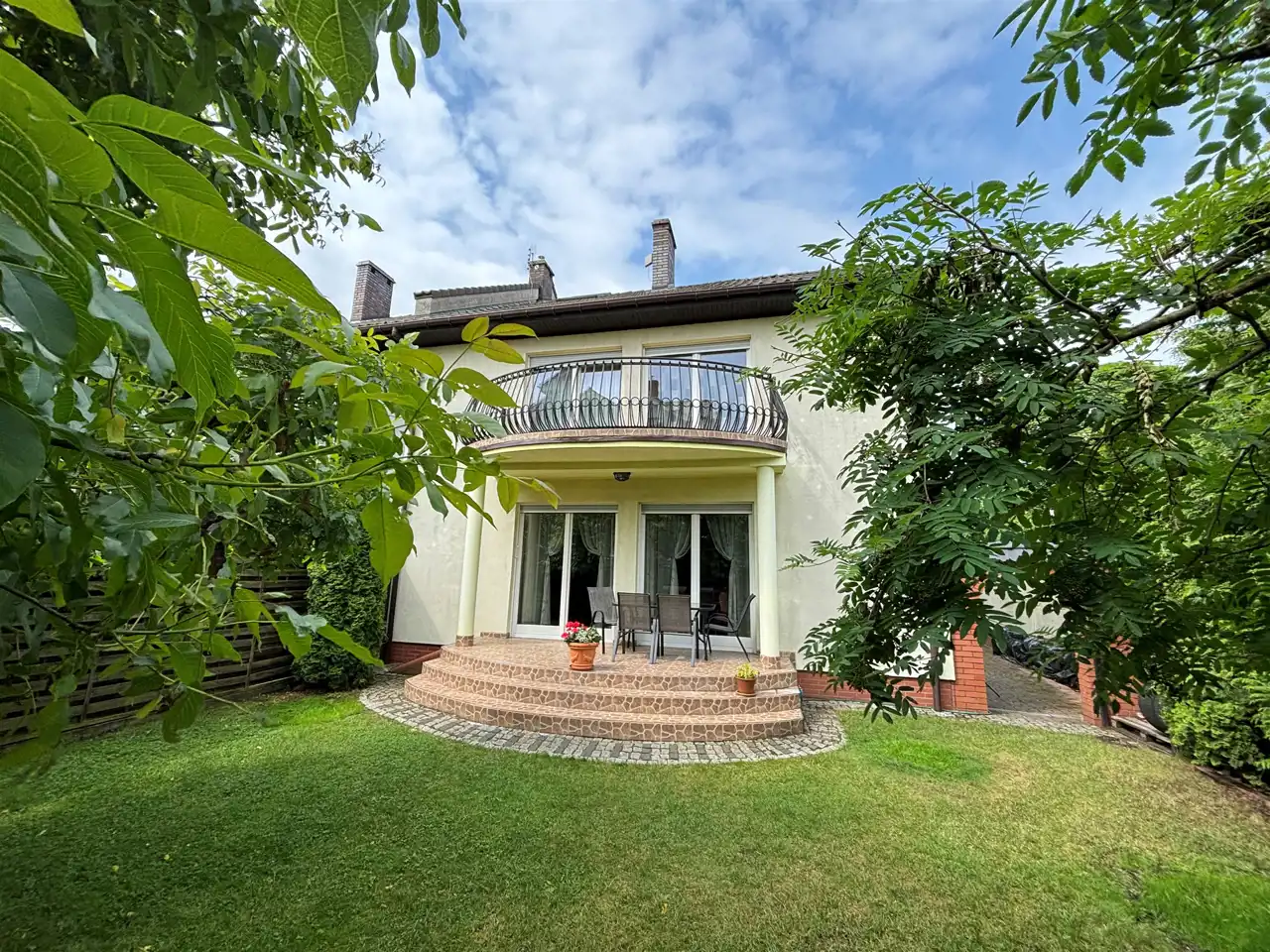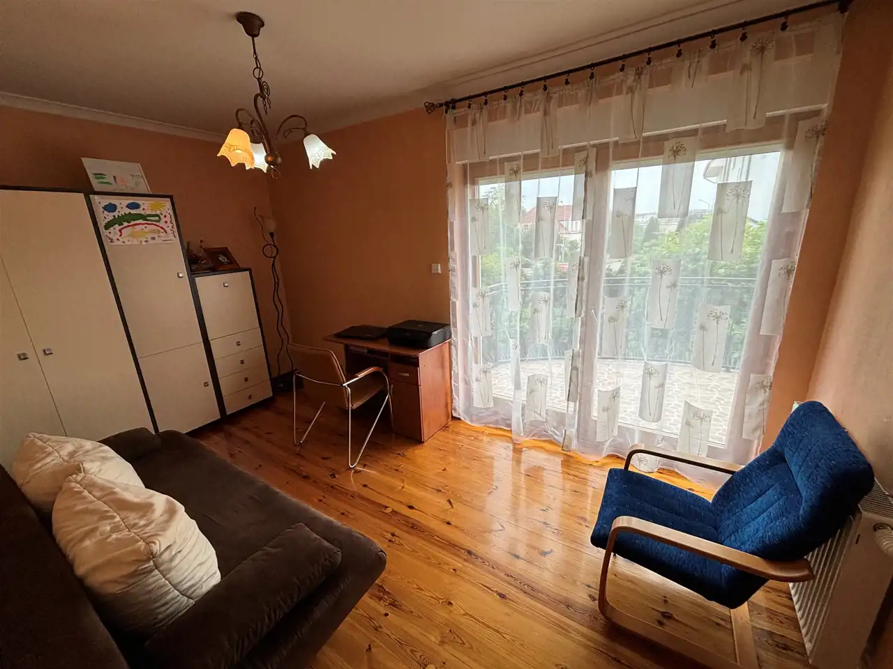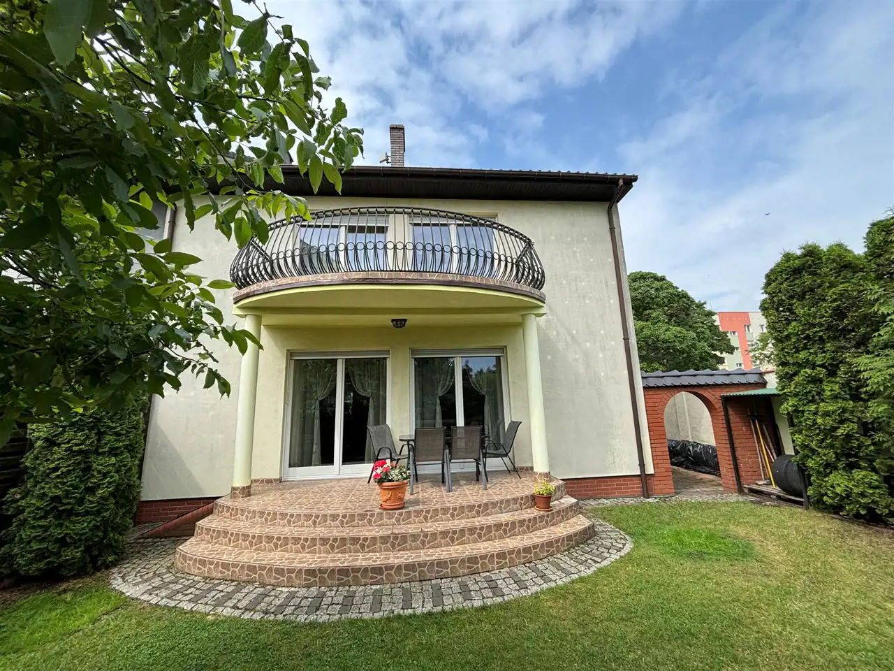 Dom w zabudowie szeregowej przy ul. Turkusowej. Na parterze budynku znajdują się: salon z aneksem kuchennym, przedpokój, toaleta i garaż. Pietro budynku mieści dwie sypialnie z wyjściem na balkon, pokój, obszerną łazienkę, i schowek podręczny. Na poddaszu znajduje się obszerny pokój. Budynek wykonany z cegły kratówki, ocieplony styropianem (10 cm) pokryty dachówką cementową. Stolarka drzwiowa i okienna (wewnętrzna i zewnętrzna), a także schody bukowe. Podłogi sosnowe. Żaluzje na wszystkich oknach elektrycznie. Ogrzewanie gazowe. W kuchni, toalecie i łazience ogrzewanie podłogowe. Na wyposażeniu domu pozostają meble i urządzenia kuchenne widoczne na zdjęciach. Kupujący nie płaci prowizji dla biura nieruchomości. Wynagrodzenie biura nieruchomości w całości pokrywa sprzedający.