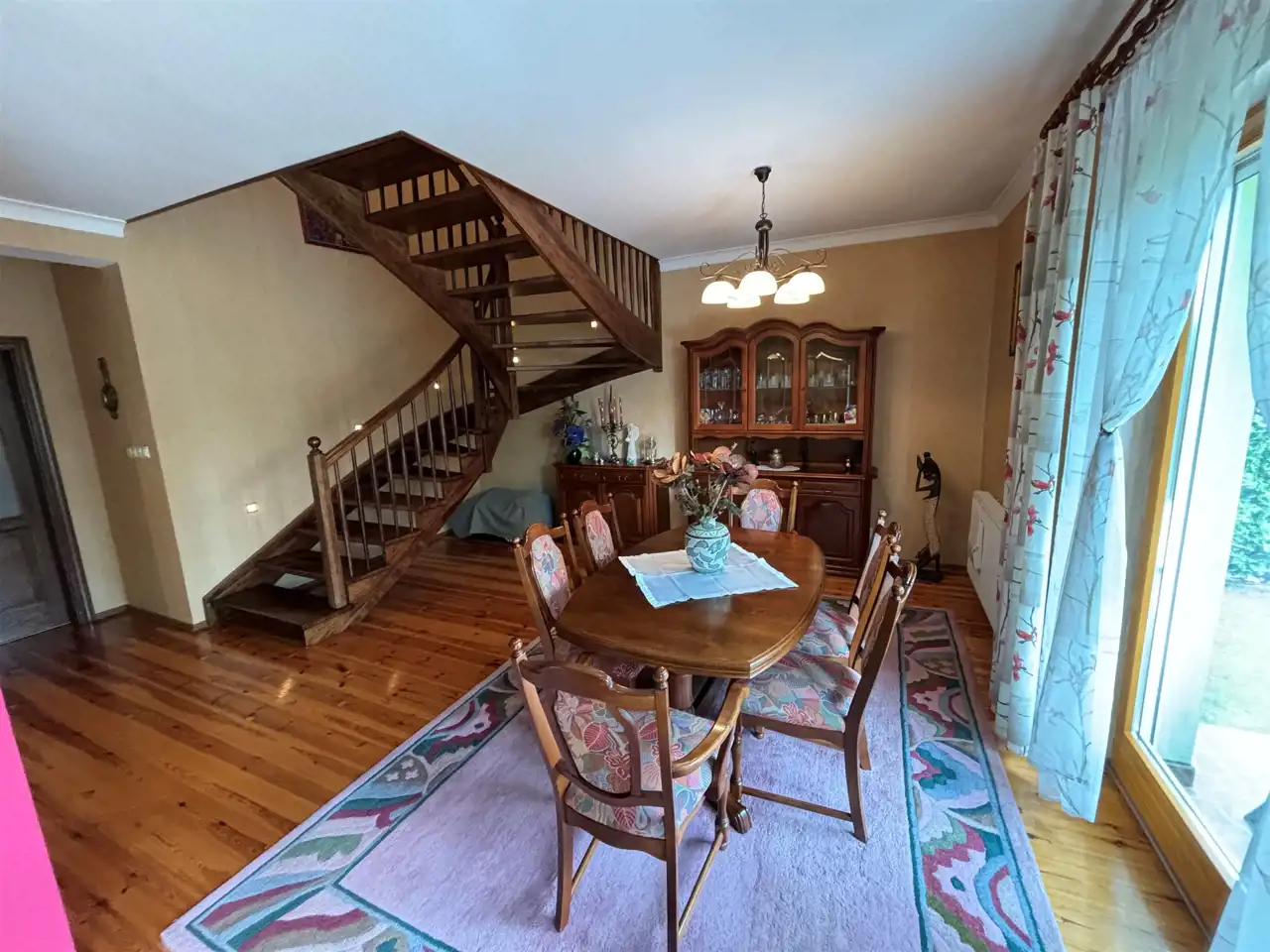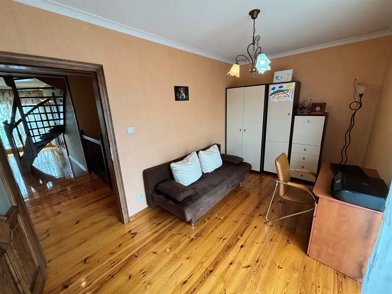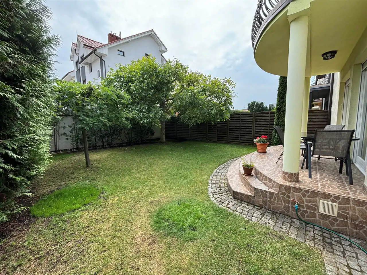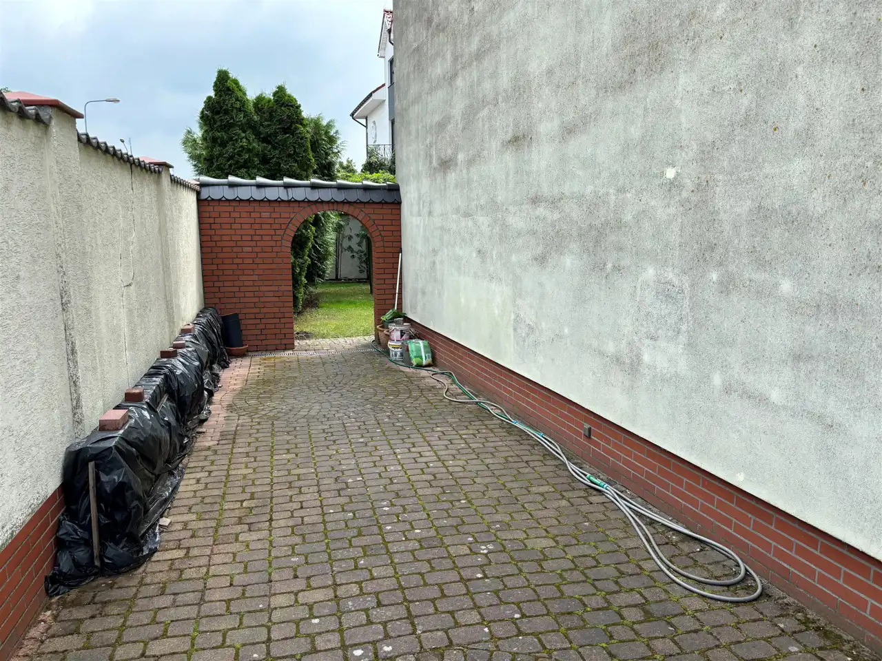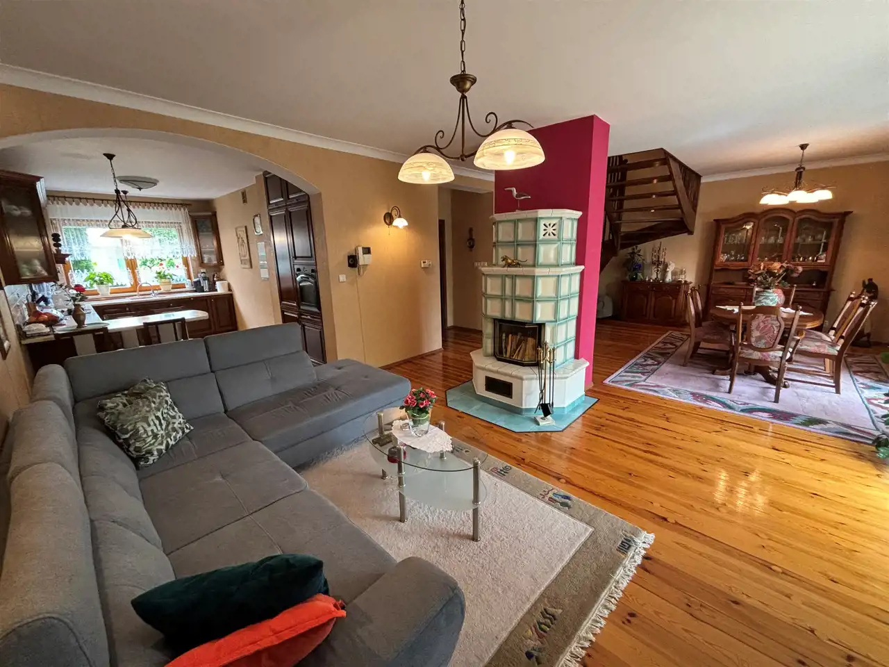 Dom w zabudowie szeregowej przy ul. Turkusowej. Na parterze budynku znajdują się: salon z aneksem kuchennym, przedpokój, toaleta i garaż. Pietro budynku mieści dwie sypialnie z wyjściem na balkon, pokój, obszerną łazienkę, i schowek podręczny. Na poddaszu znajduje się obszerny pokój. Budynek wykonany z cegły kratówki, ocieplony styropianem (10 cm) pokryty dachówką cementową. Stolarka drzwiowa i okienna (wewnętrzna i zewnętrzna), a także schody bukowe. Podłogi sosnowe. Żaluzje na wszystkich oknach elektrycznie. Ogrzewanie gazowe. W kuchni, toalecie i łazience ogrzewanie podłogowe. Na wyposażeniu domu pozostają meble i urządzenia kuchenne widoczne na zdjęciach. Kupujący nie płaci prowizji dla biura nieruchomości. Wynagrodzenie biura nieruchomości w całości pokrywa sprzedający.