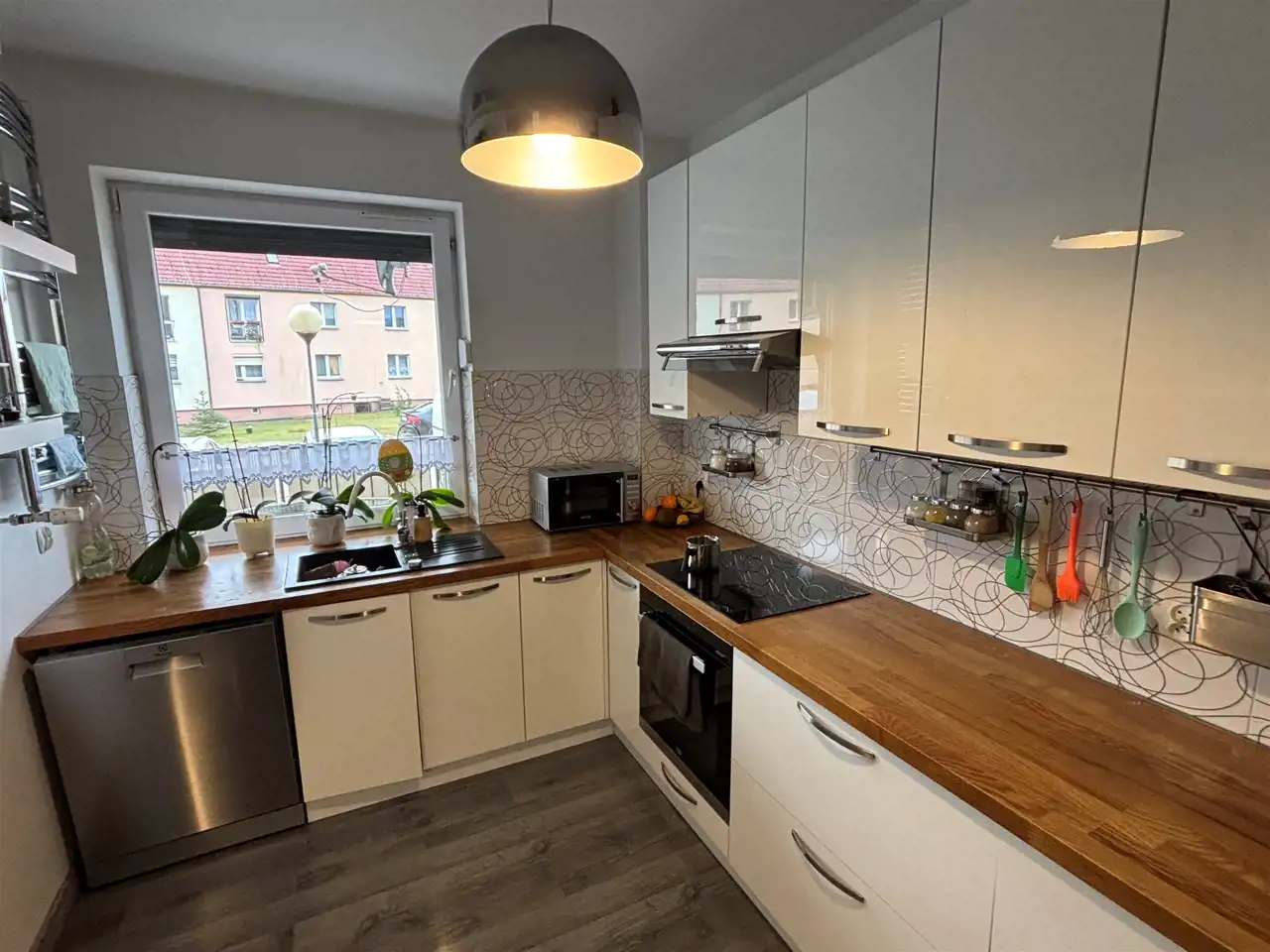 Mieszkanie w Kostrzynie nad Odrą, ul. Orła Białego. Mieszkanie składa się z salonu z wyjściem na duży balkon o powierzchni 10 m2, kuchni, sypialni, przedpokoju, garderoby i łazienki z WC. Powierzchnia 53,14 m2, parter, ogrzewanie i ciepła woda gazowe. Miesięczny czynsz do wspólnoty mieszkaniowej przy założeniu, że w mieszkaniu na stałe przebywają 2 osoby wynosi 400 zł. Meble i urządzenia kuchenne zainstalowane na stałe, pozostają na wyposażeniu mieszkanie. Kupujący nie płaci prowizji dla biura nieruchomości. Wynagrodzenie biura nieruchomości w całości pokrywa sprzedający.