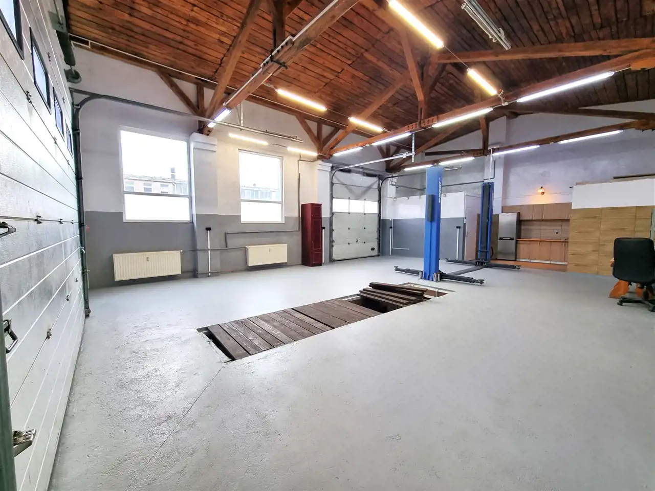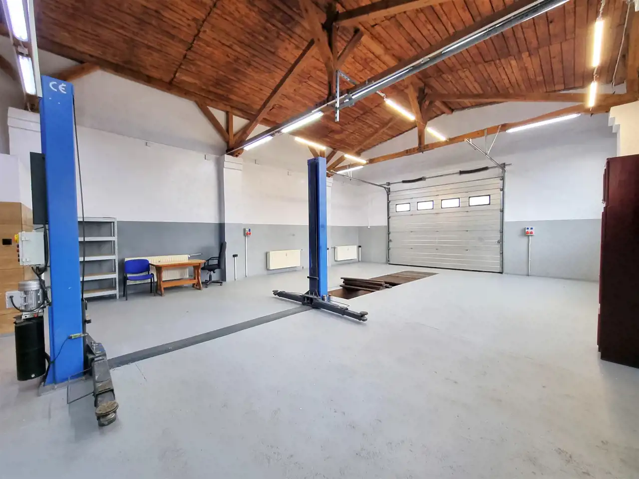 LOKAL wyposażona jest w siłę, oświetlenie Led, kompresor, podnośnik 4,2 T, rozstaw- 3,60m-jedno ramie 1,80m, kanał o wymiarach 4,80m na 1,10m, głębokość 1,65m, z zabezpieczeniem 24v, opłytkowany, z przewodem kompresorowym.