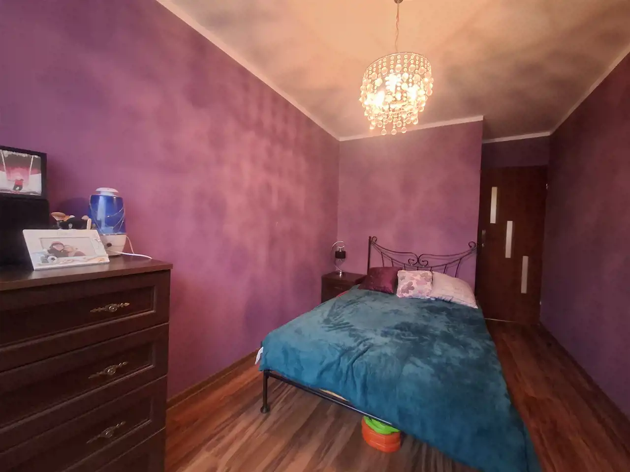 W oknach zamontowane rolety zewnętrzne, na scianach gładzie gipsowe, na podłodze panele oraz płytki, okna PCV.