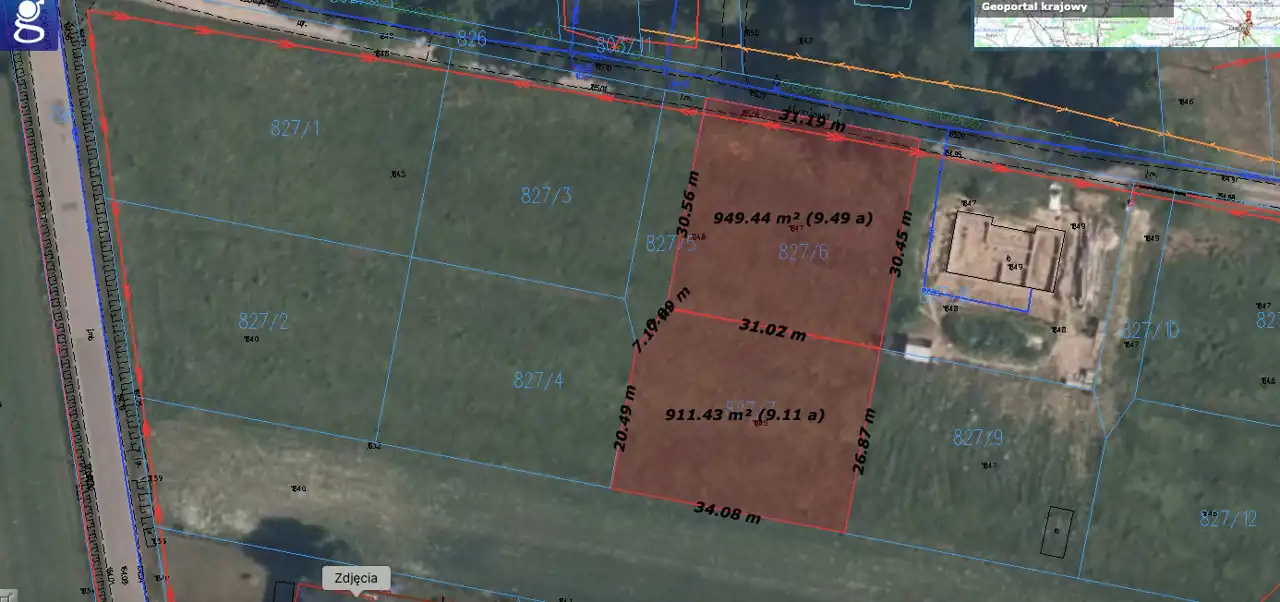 - 2 linia zabudowy: 912 m2; wymiary: 31m x 27m