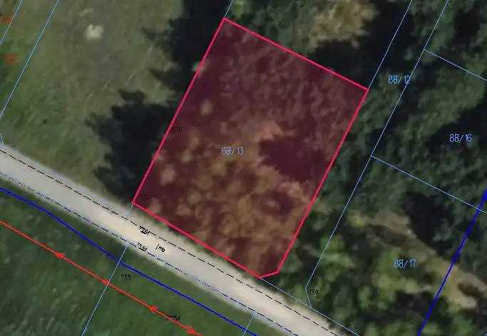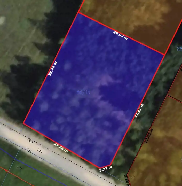 Działka z wydaną decyzją o warunkach zabudowy, budynku mieszkalnego jednorodzinnego z garażem w bryle. Powierzchnia zabudowy 50-70 m2 Szerokość elewacji frontowej od 8 m do 12 m. Wysokość górnej elewacji frontowej od 2,3 m do 3,5 m. Wysokość kalenicy od 7 m do 9,5 m. Dach dwuspadowy lub wielospadowy o nachyleniu połaci 35-45 °. Układ kalenicy głównej dachu prostopadły lub równoległy w stosunku do frontu działki. Nieprzekraczalna linia zabudowy, co najmniej 15 m od drogi wewnętrznej (nr 114), 6 m od drogi wewnętrznej (nr 88/1). Wskaźnik powierzchni zabudowy w stosunku do powierzchni działki od 4,5% do 6,4%