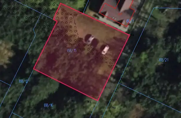 Działka z wydaną decyzją o warunkach zabudowy, budynku mieszkalnego jednorodzinnego z garażem w bryle. Powierzchnia zabudowy 50-70 m2 Szerokość elewacji frontowej od 8 m do 12 m. Wysokość górnej elewacji frontowej od 2,3 m do 3,5 m. Wysokość kalenicy od 7 m do 9,5 m. Dach dwuspadowy lub wielospadowy o nachyleniu połaci 35-45 °. Układ kalenicy głównej dachu prostopadły lub równoległy w stosunku do frontu działki. Nieprzekraczalna linia zabudowy, co najmniej 15 m od drogi wewnętrznej (nr 114), 6 m od drogi wewnętrznej (nr 88/1). Wskaźnik powierzchni zabudowy w stosunku do powierzchni działki od 4,5% do 6,4%