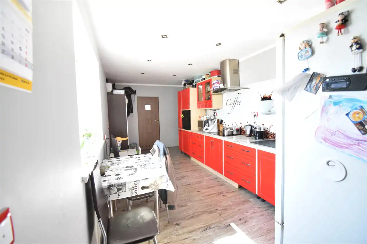 W dalszej części domu jest kuchnia i 3 pokoje. Zarówno w dolnej części jak i górnej jest położone ogrzewanie podłogowe. W obu częściach jest odkurzacz centralny co ułatwia utrzymanie porządku na co dzień.