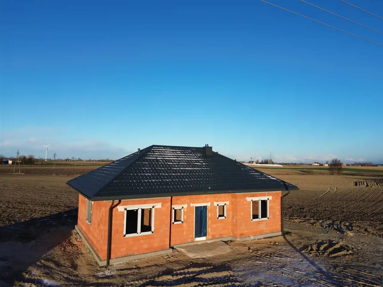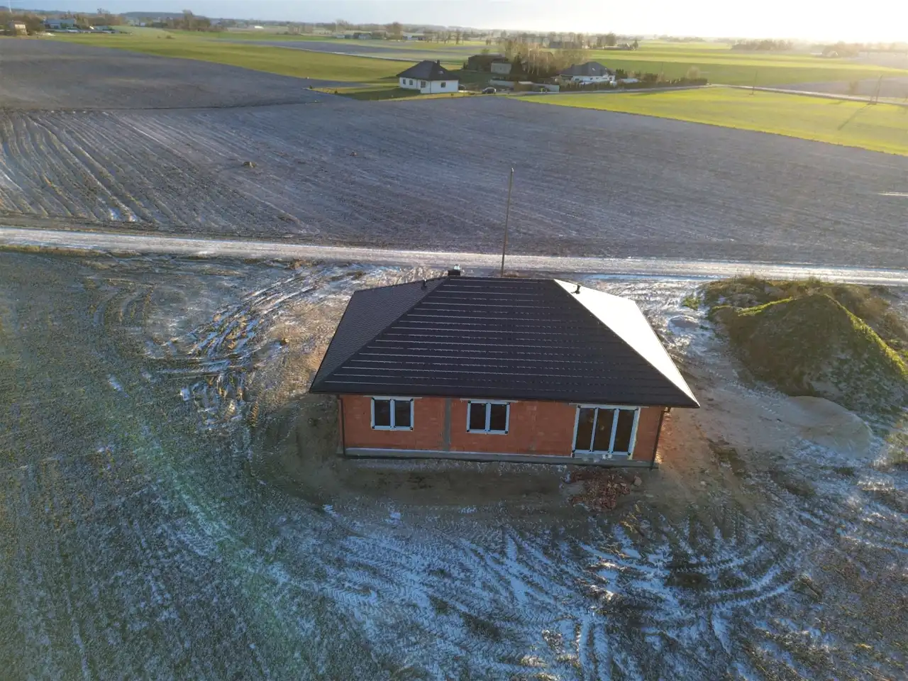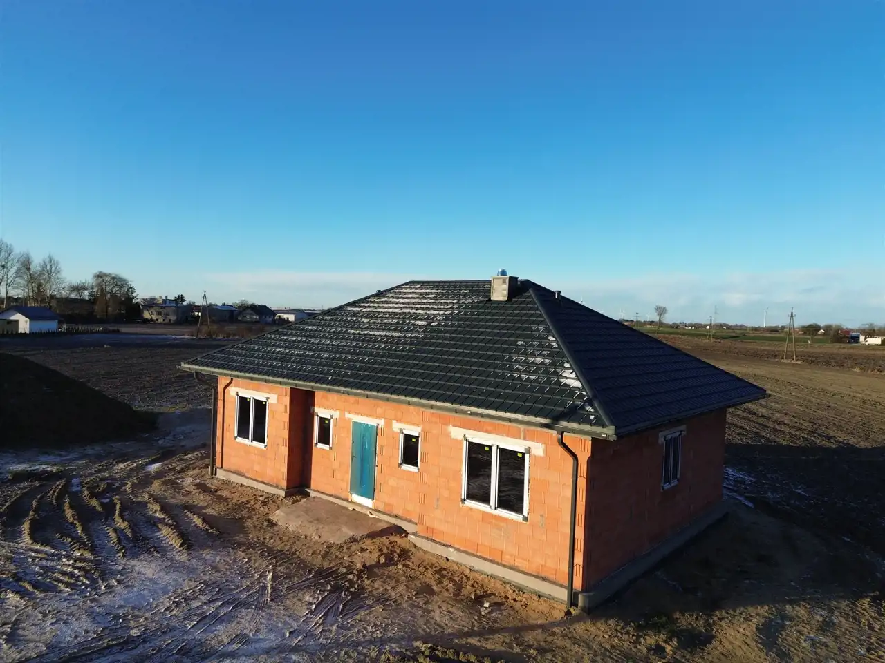 Dom wybudowany z pustaka ceramicznego; więźba dachowa - wiązary prefabrykowane w klasie drewna C24; dach pokryty blachodachówką; okna 3-szybowe ciepły montaż; drzwi zewnętrzne antywłamaniowe.