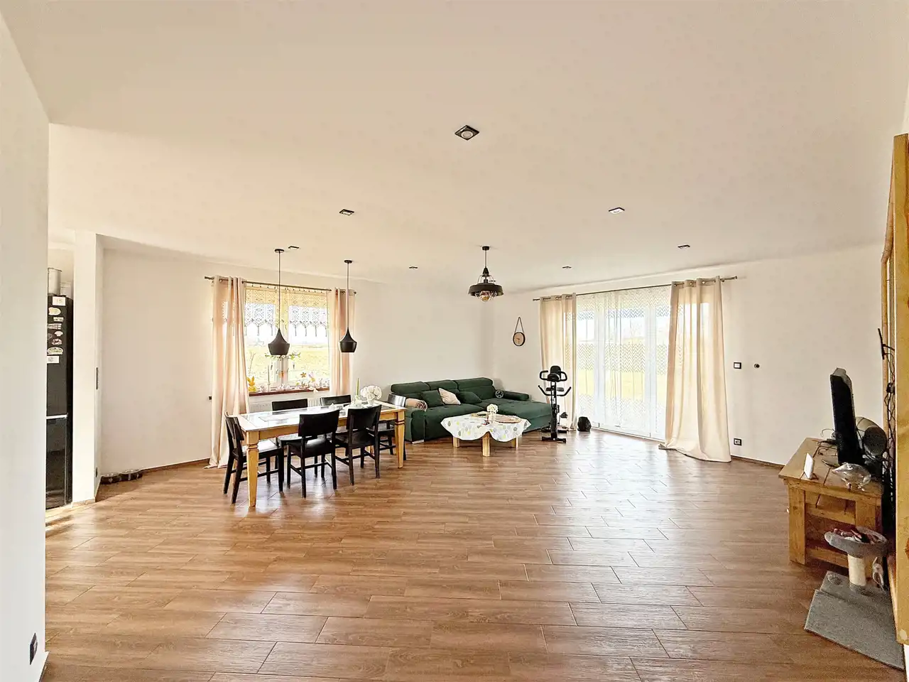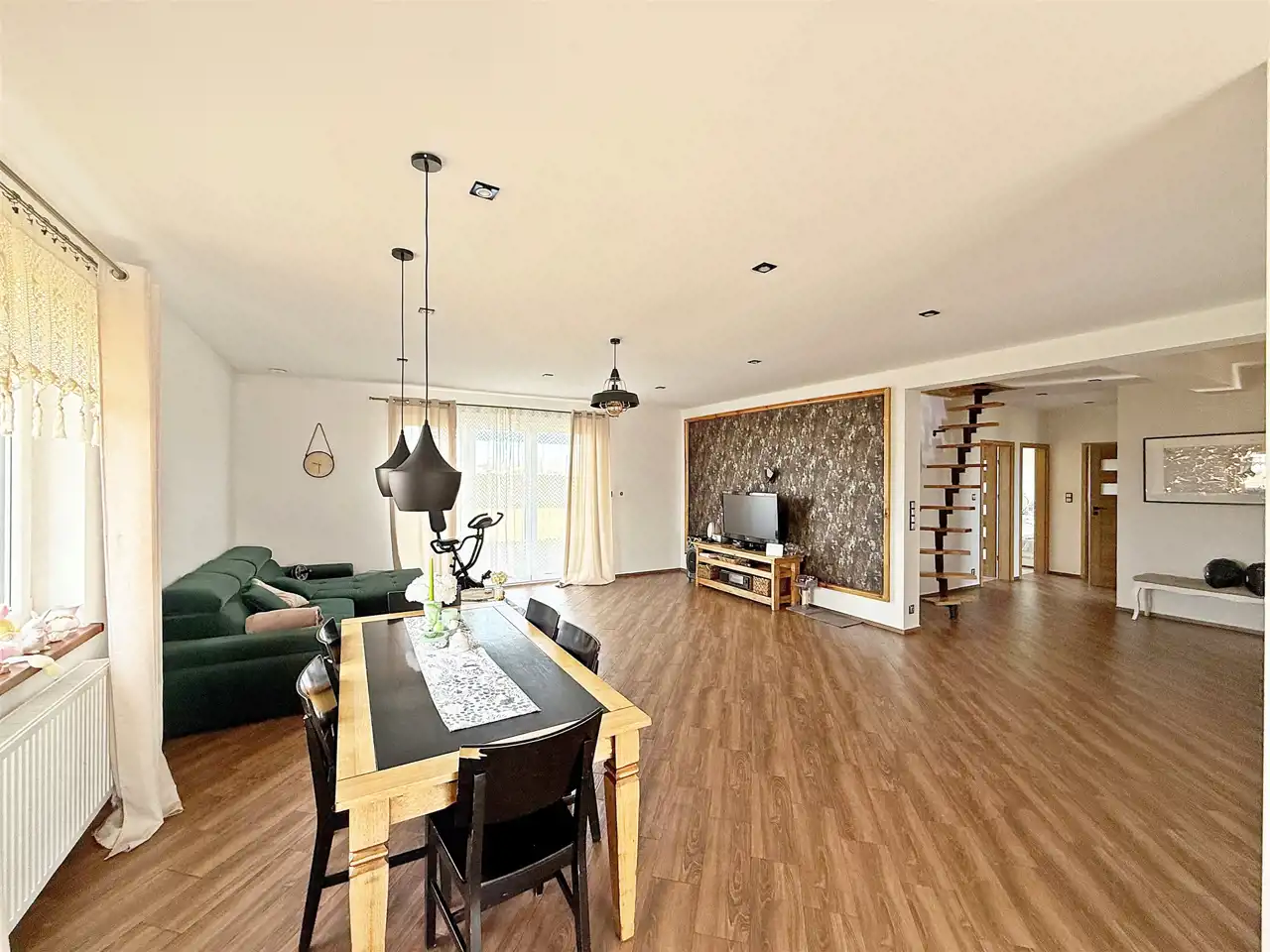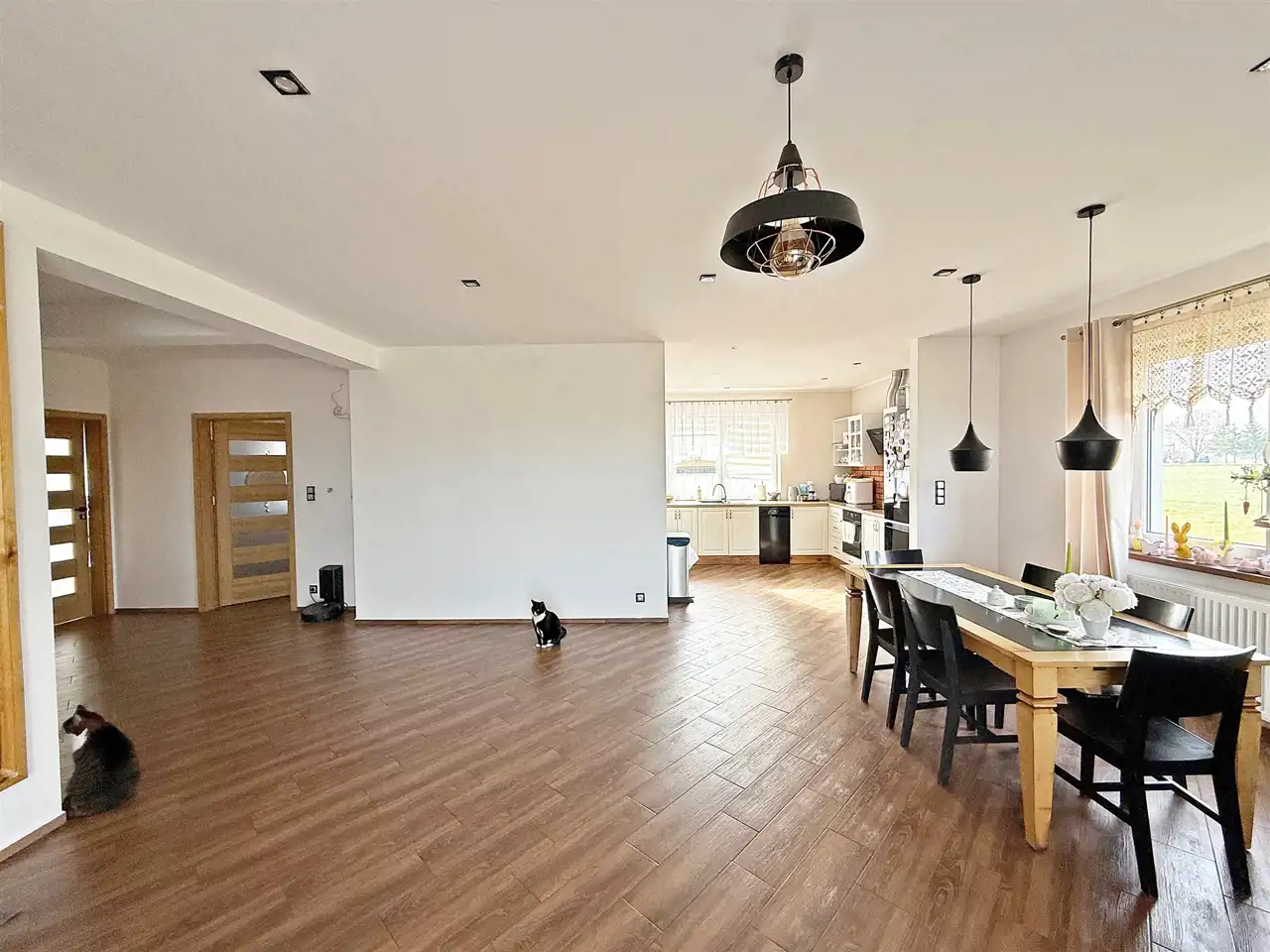 - przestronny salon 37,5 m2 z wyjściem na taras połączony z otwartą kuchnią 9,7 m2