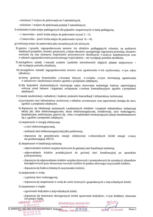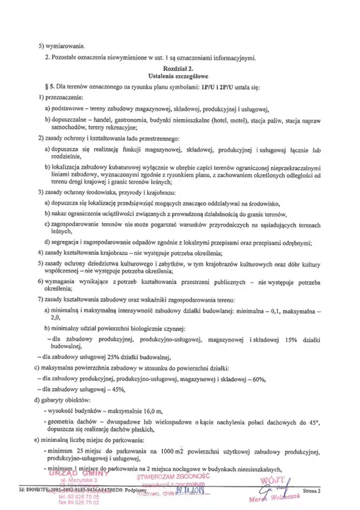 Nieruchomość objęta Miejscowym Planem Zagospodarowania Przestrzennego, w którym teren posiada przeznaczenie podstawowe zabudowy magazynowej, składowej, produkcyjnej i usługowej (dopuszczalne – handel, gastronomia, budynki niemieszkalne (hotel, motel), stacja paliw, stacja napraw samochodów, tereny rekreacyjne). Dopuszcza się lokalizację przedsięwzięć mogących znacząco oddziaływać na środowisko.