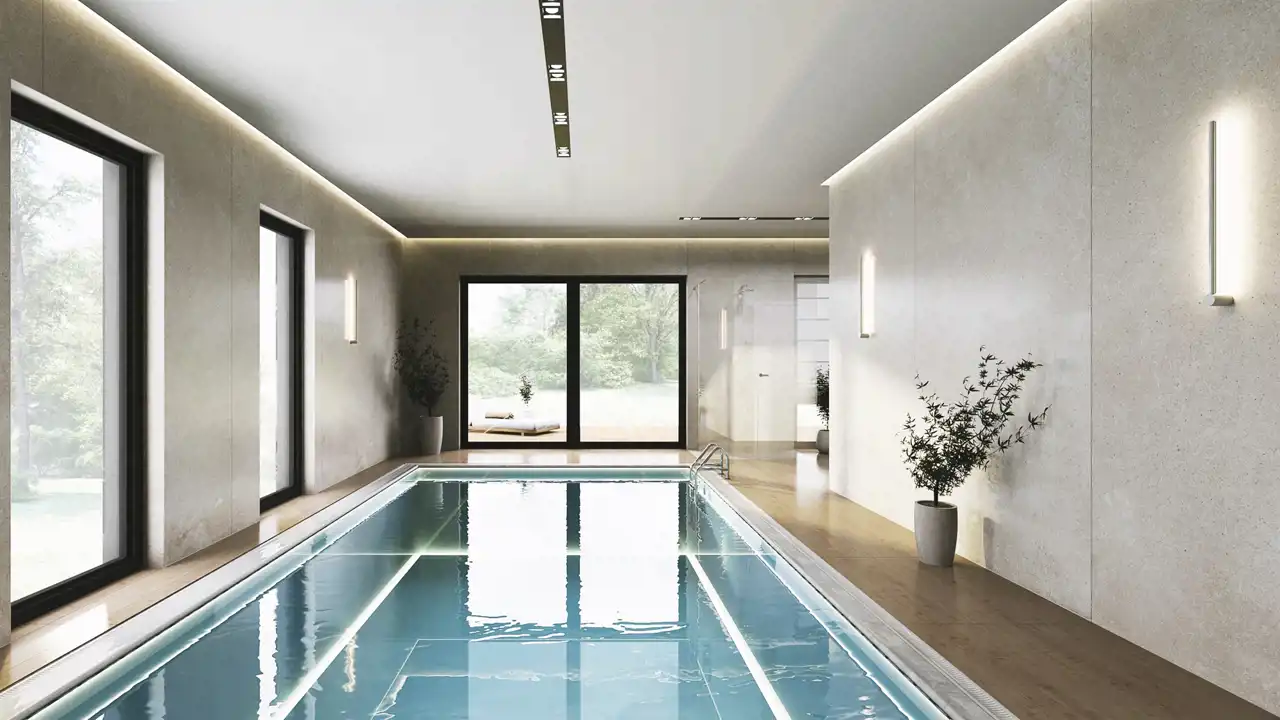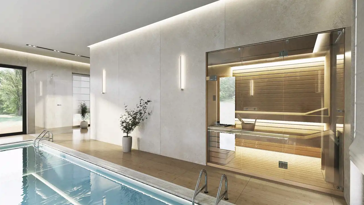 Strefę SPA, w której znajdziemy basen o wymiarach 6x3m z przeciwprądem i podświetleniem, miejsce na saunę, jakuzzi, toaletę oraz prysznic