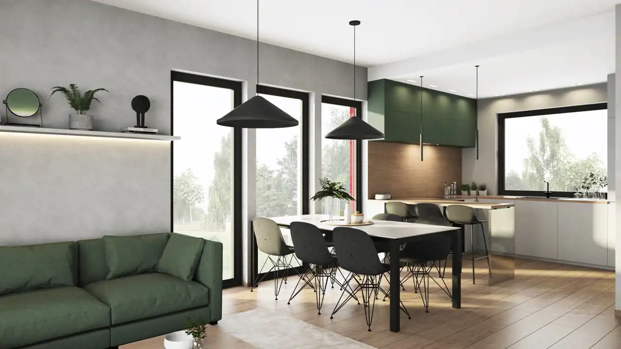 Strefę dzienną z dużym, jasnym salon z otwartą kuchnia i jadalnią, wygodną komunikację oraz toaletę