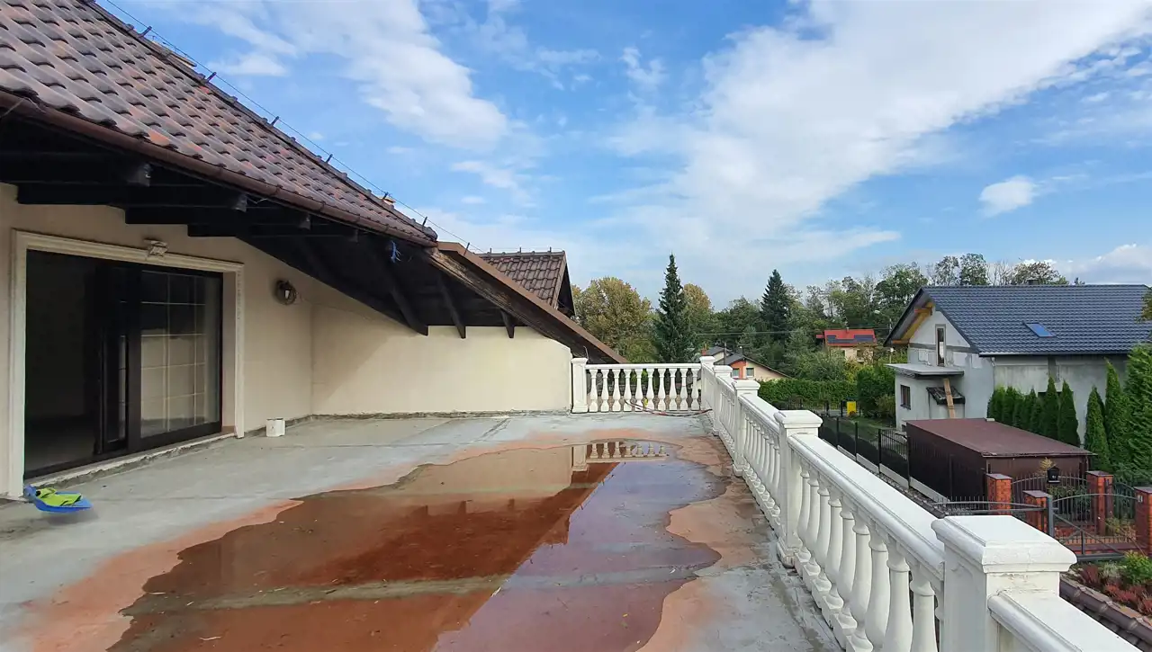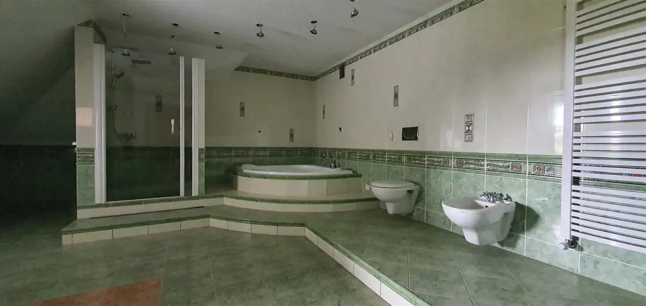 To wyjątkowa rezydencja z poddaszem użytkowym, częściowo podpiwniczona, z garażem dwustanowiskowym o powierzchni 50m2 oraz możliwością zaparkowania na podjeździe czterech samochodów, do której prowadzą ozdobne drzwi wejściowe z rzeźbionego dębu. Niezwykle przestrzenne salony z tarasami na wszystkie strony świata, otwarta kuchnia ze spiżarnią oraz salonem jadalnym czynią tę rezydencję wyjątkową zarówno pod względem architektury jak i funkcjonalności. Budynek w całości wykończony od piwnic po strych, który zmieniono w dodatkowe wnętrza. W pokojach piękne, włoskie, kamienne gresy, łączą się z dębowym drewnem. Na górę prowadzą obszerne drewniane schody. W rezydencji mamy do dyspozycji ogromne szafy w zabudowie oraz wspaniały pokój kąpielowy na piętrze o powierzchni ok 30m2. Malowniczo położona rozległa działka o powierzchni 3833m2, idealnie naświetlona o lekkim nachyleniu, w całości jest ogrodzona ogrodzeniem murowanym z ozdobnymi i kutymi elementami stalowymi.