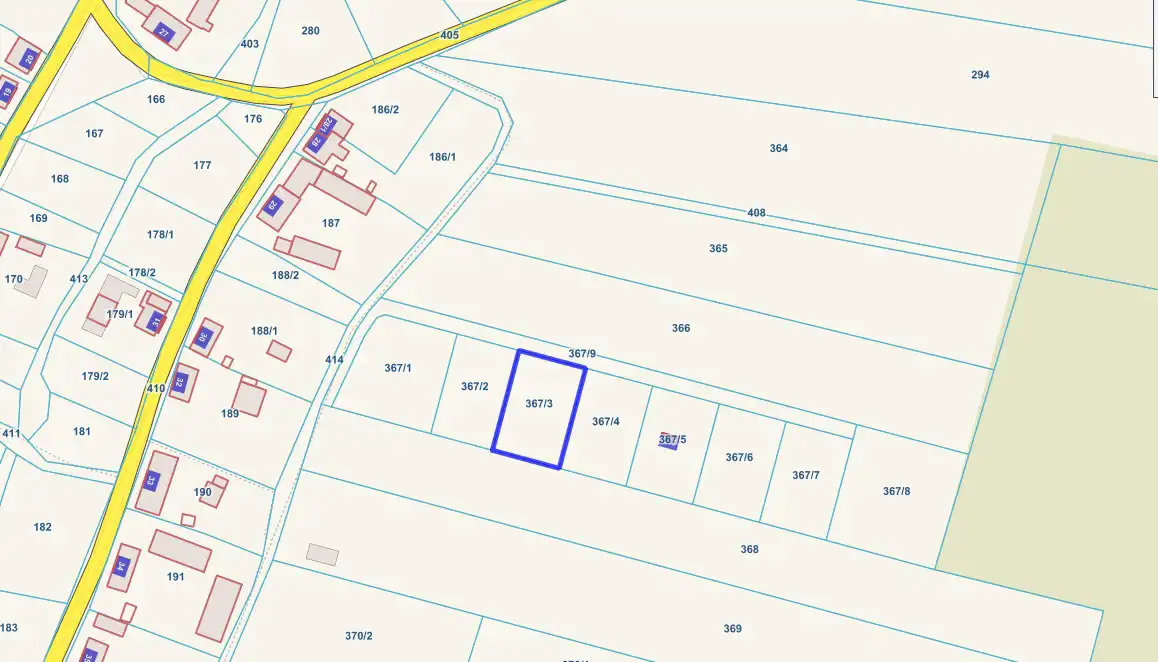 Media: woda z sieci wiejskiej, prąd w ulicy, możliwość instalacji butli z gazem płynnym.