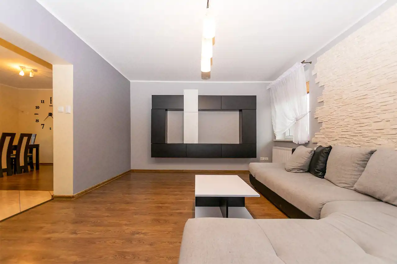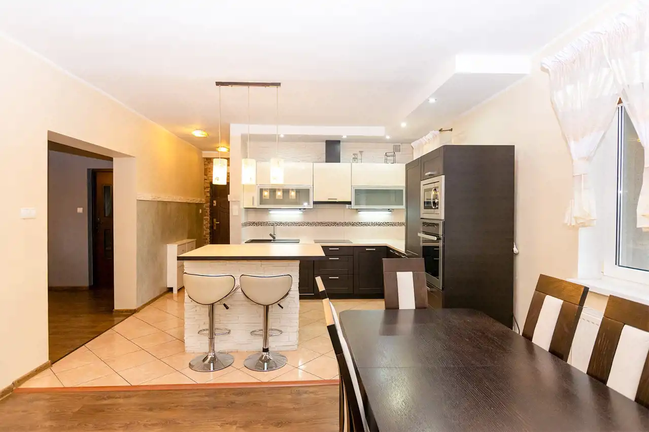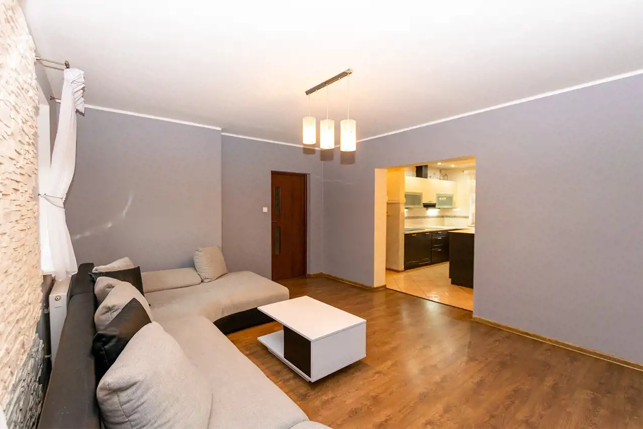 Mieszkanie jest umeblowane i gotowe do zamieszkania. Genialny układ. Przestronna kuchnia z wyspą połączona z jadalnią. Osobny salon, sypialnia i pokój, np. dla dziecka. Dodatkowo do użytku jest pomieszczenie techniczne (dawniej kotłownia). Szafy garderobiane, łóżko, narożnik, meble, kuchnia oraz sprzęty AGD na wyposażeniu.