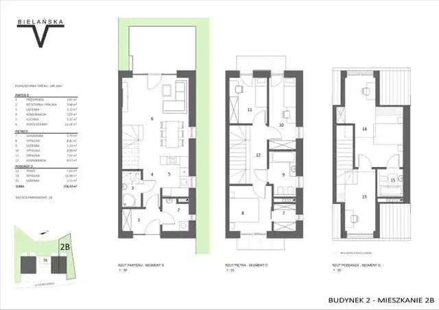Architektura budynków łączy nowoczesny design z prostą elegancją. Inwestycja została zaprojektowana z myślą o klientach premium, ceniących ekskluzywność i komfort. Każdy z 4 segmentów ma 108 mkw. powierzchni użytkowej (130 mkw. pow. całkowitej). Klienci docenią dbałość o detale i wysoki standard wykończenia. Inwestycja jest wykonana z wysokiej jakości trwałych i ekologicznych materiałów.