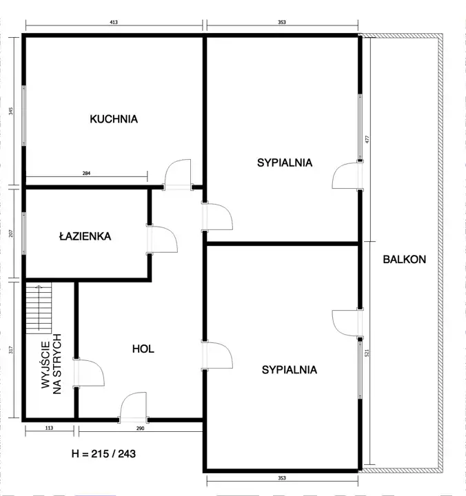 Piętro: dwa pokoje, kuchnia, łazienka, przedpokój