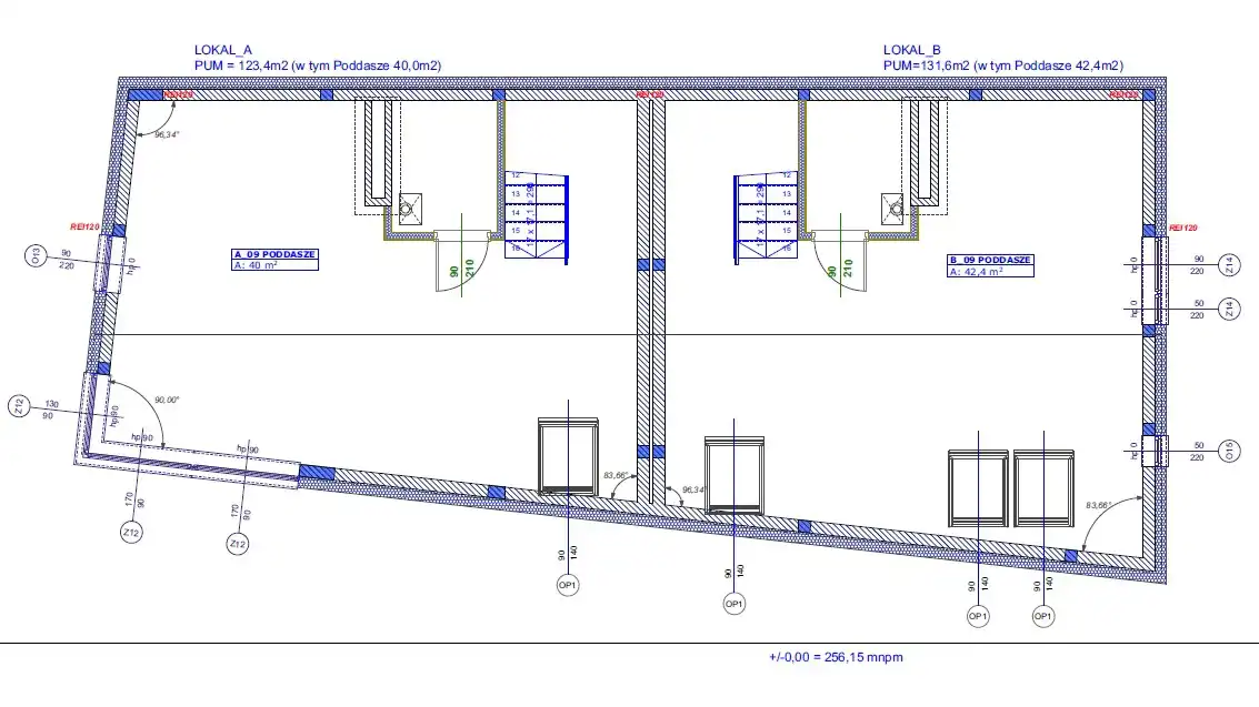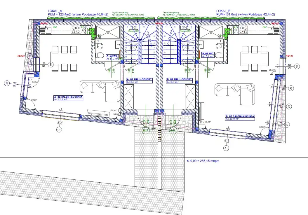 - Lokal A: powierzchnia użytkowa 131,63 m²,