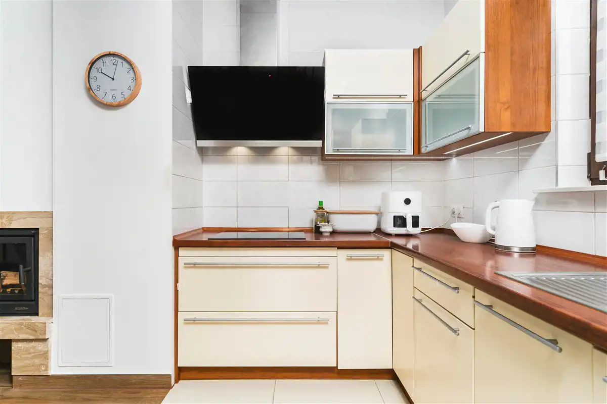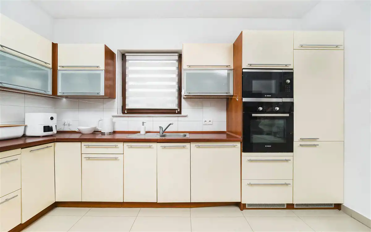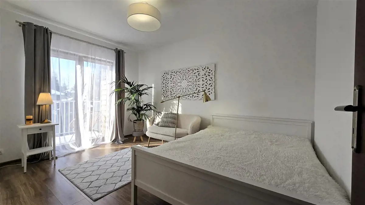 Apartament o powierzchni użytkowej 112,94 m2, z 2016 roku, gotowy do wejścia i wykończony w wysokim standardzie. Z salonu jest wejście na piękny, zadbany ogród. Z dwóch pokoi na pierwszym piętrze jest wyjście na duży balkon. Wyjście na balkon oraz ogród jest od strony południowej. Okna drewniane nowego typu. Dach jest z blachy. Ogrzewanie i ciepła woda - piec gazowy dwufunkcyjny. Na podłodze w pokojach są panele, natomiast w przedpokoju, kuchni i łazienkach są płytki. Kuchnia jest wyposażona w: lodówkę, zmywarkę, płytę indukcyjną, piekarnik, okap i mikrofalówkę.