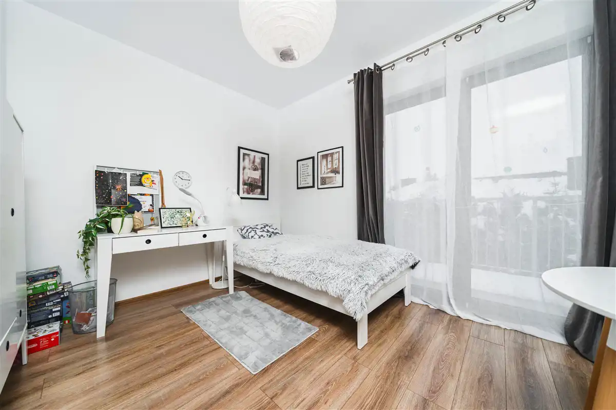 - 2 osobne pokoje o powierzchni ok. 13 m2 i ok. 11 m2, które są połączone jednym dużym balkonem
