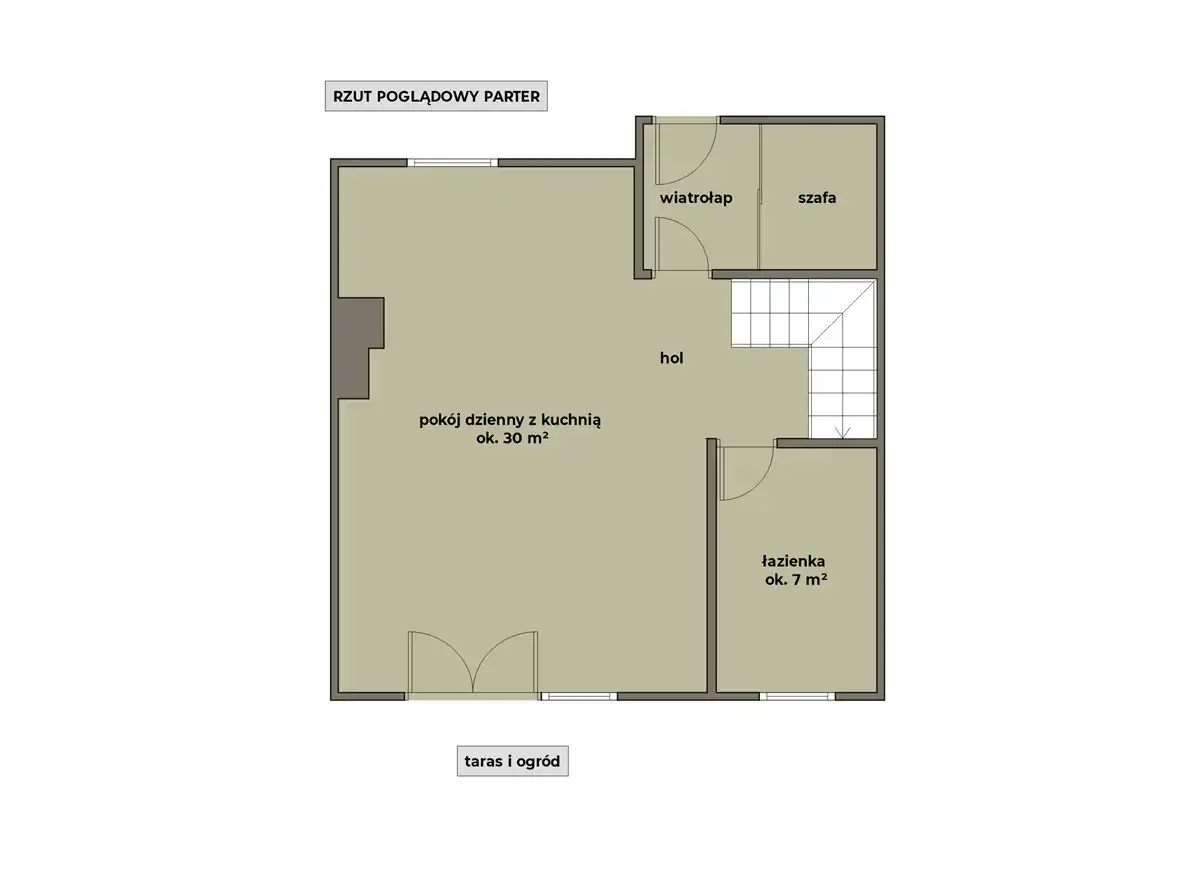 - Kuchnia z salonem (ok. 30 m2) + wyjście na taras i ogród