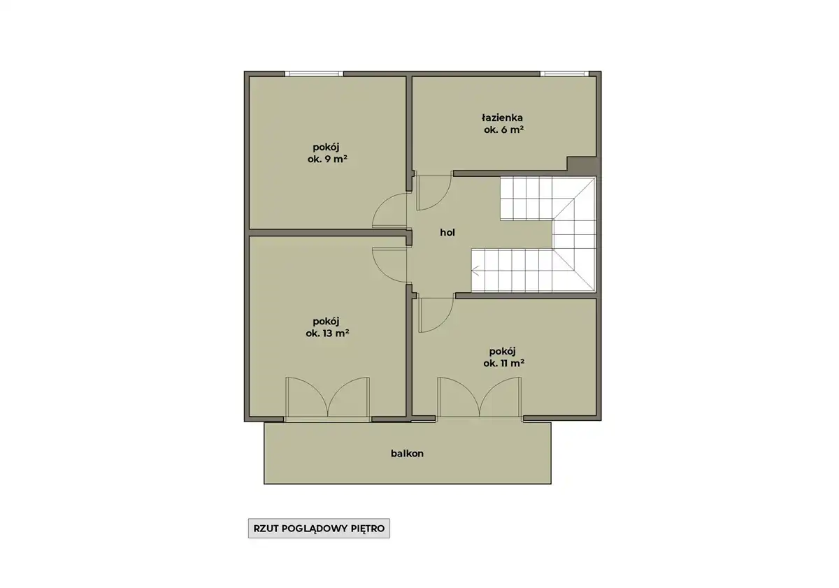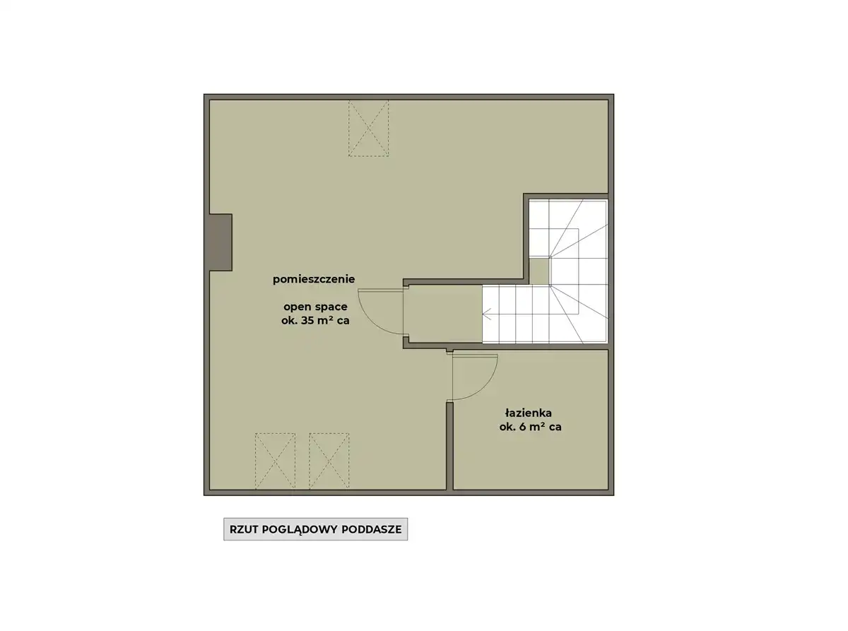 - Poddasze - pomieszczenie typu open space do indywidualnej aranżacji (ok. 35 m2 powierzchni całkowitej)