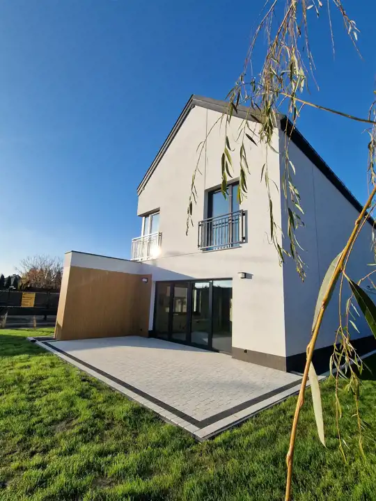 Nowoczesny duży dom wolnostojący w stanie deweloperskim, komfortowe rozplanowanie wnętrza, taras i ogród.