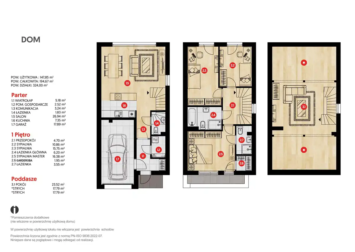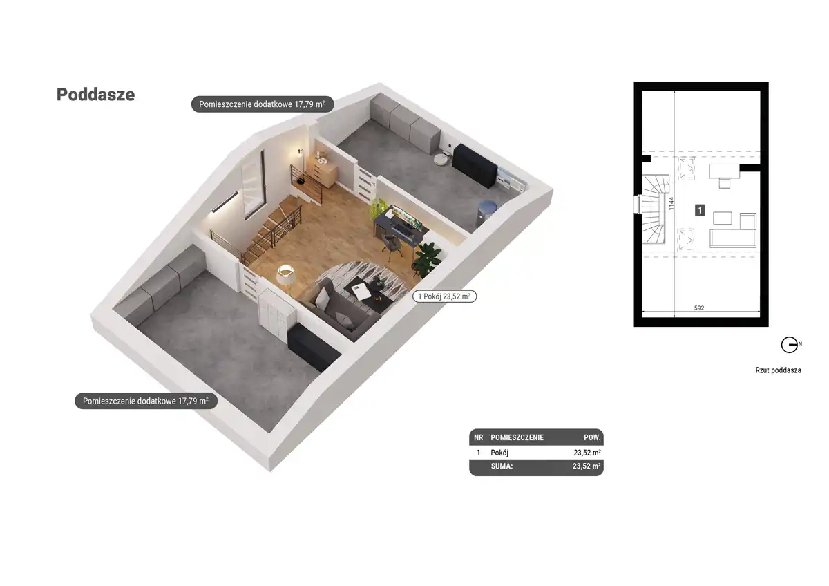 poddasze: przestronne studio (21,99 m2) do wykorzystania na biuro/gabinet, siłownię, bawialnię itp., 2 dodatkowe pomieszczenia ze skosami (po ok. 17,5 m2 - nie liczone do metrażu domu), idealne do przechowywania .