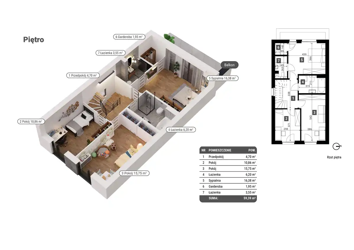 piętro (57,65 m2): sypialnia główna (16,16 m2) z łazienką (5,15 m2) i garderobą (2,33 m2), 2 niezależne sypialnie (12,54 i 10,02 m2), łazienka (3,11 m2), pralnia (3,91), przedpokój