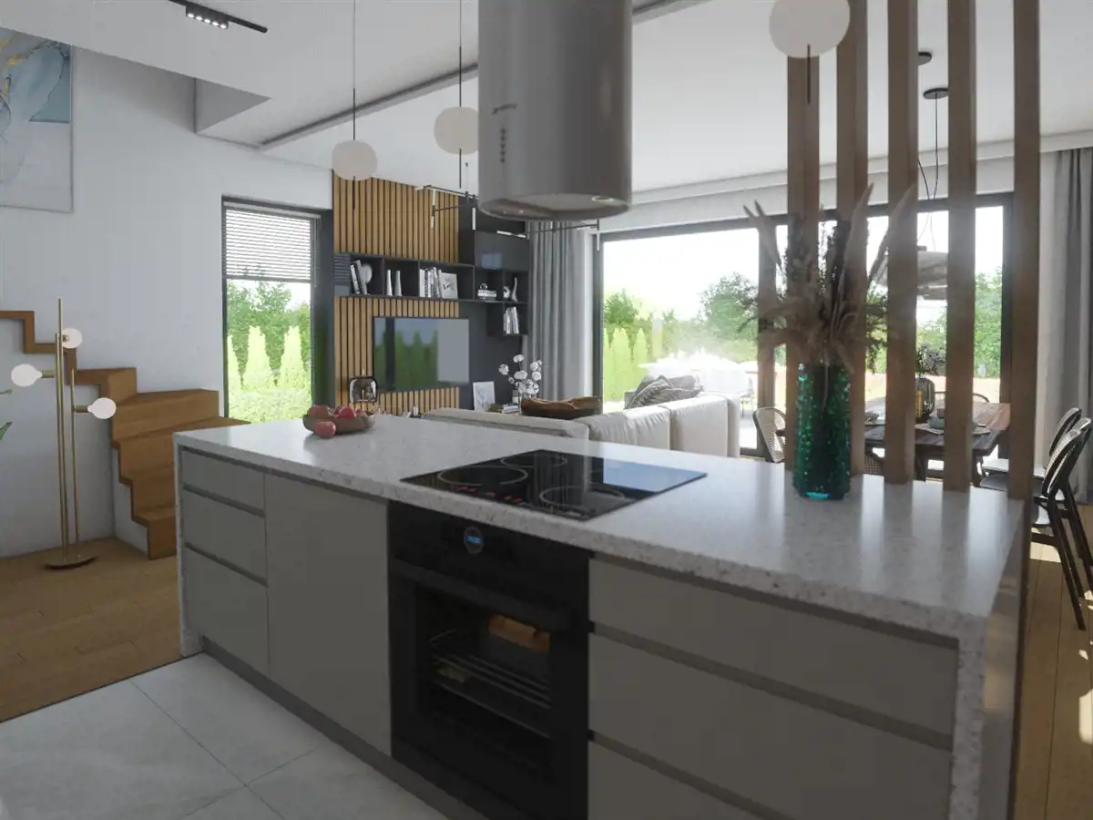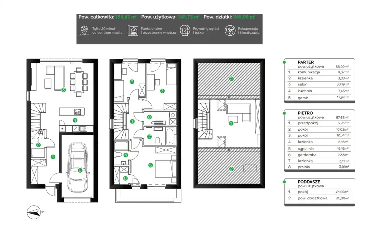 parter (68,29 m2): przestronny salon (30,19 m2) z aneksem kuchennym (7,43 m2), toaleta, komunikacja, wiatrołap, pomieszczenie gospodarcze, garaż (17,97 m2)