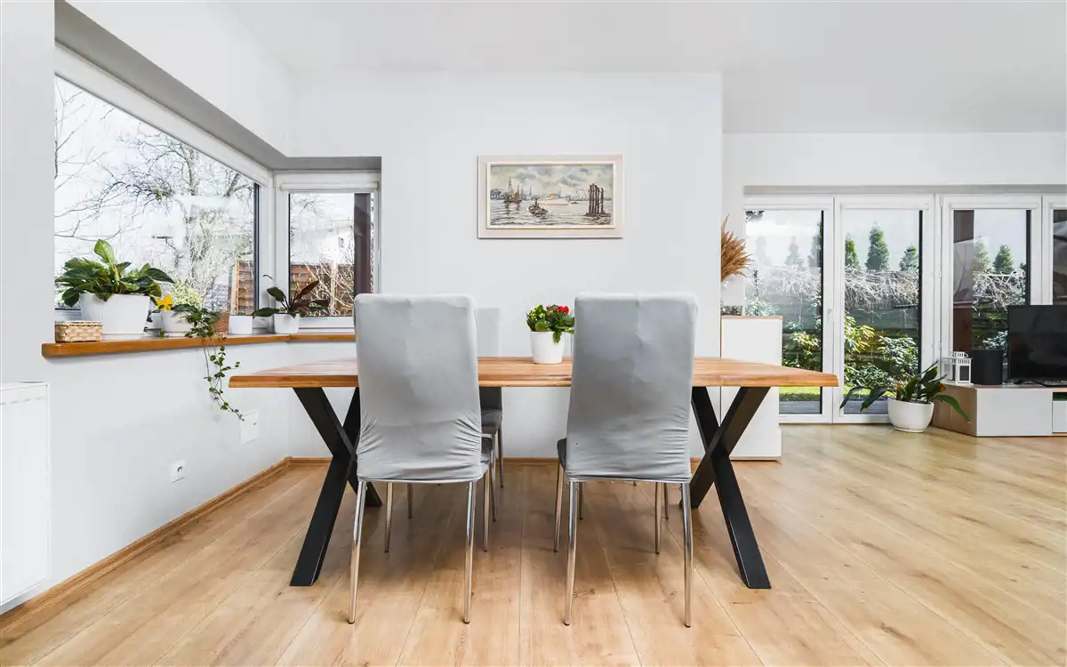 Dom o powierzchni całkowitej ok. 146 m2 i powierzchni użytkowej ok. 124 m2 m2, z 2016 roku, gotowy do wejścia i wykończony w wysokim standardzie. Z salonu jest wejście na piękny, zadbany ogród oraz taras. Na piętrze w pokojach są balkony francuskie. Okna PCV. Dach jest z dachówki ceramicznej. Ogrzewanie i ciepła woda - piec gazowy dwufunkcyjny. Na podłodze w pokojach są panele, natomiast w przedpokoju, kuchni i łazienkach są płytki. Kuchnia jest wyposażona w: lodówkę, zmywarkę, płytę indukcyjną, piekarnik i okap.
