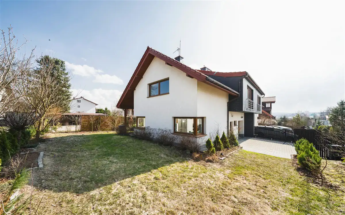 Za domem znajduje się piękny, zagospodarowany ogród, który cieszy oko niezależnie od pory roku. Ogród jest od strony północnej i wschodniej. Działka ma powierzchnię 382 m2. Jest w kształcie kwadratu. Działka jest ogrodzona oraz jest brama wjazdowa na pilota. Taras oraz pojazd jest z kostki brukowej.