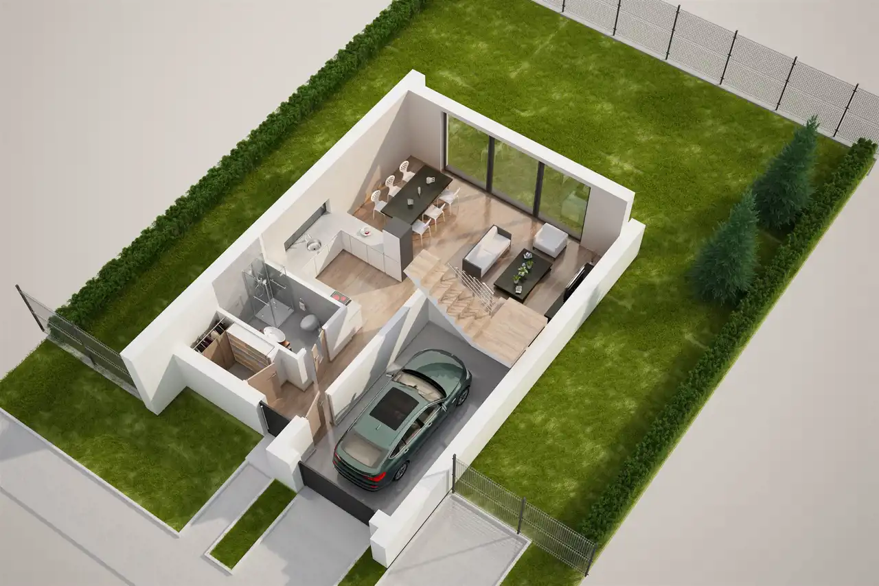 Parter: hol, pom. gospodarcze, łazienka, salon +jadalnia + kuchnia, garaż.