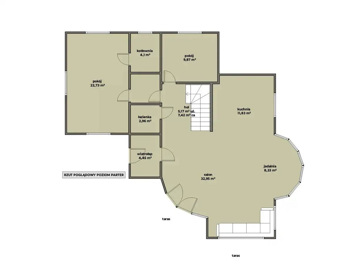 Parter (105,34 m2): przestronny salon z jadalnią i otwartą kuchnią (53,11 m2), pokój, łazienka, hol, kotłownia, wiatrołap, garaż (22,73 m2, aktualnie zaaranżowany na pokój).
