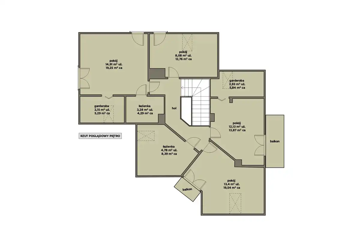 Piętro (72,11/99,68 m2): sypialnia z łazienką i garderobą, sypialnia z garderobą, kolejne 2 pokoje, łazienka, hol, schody.