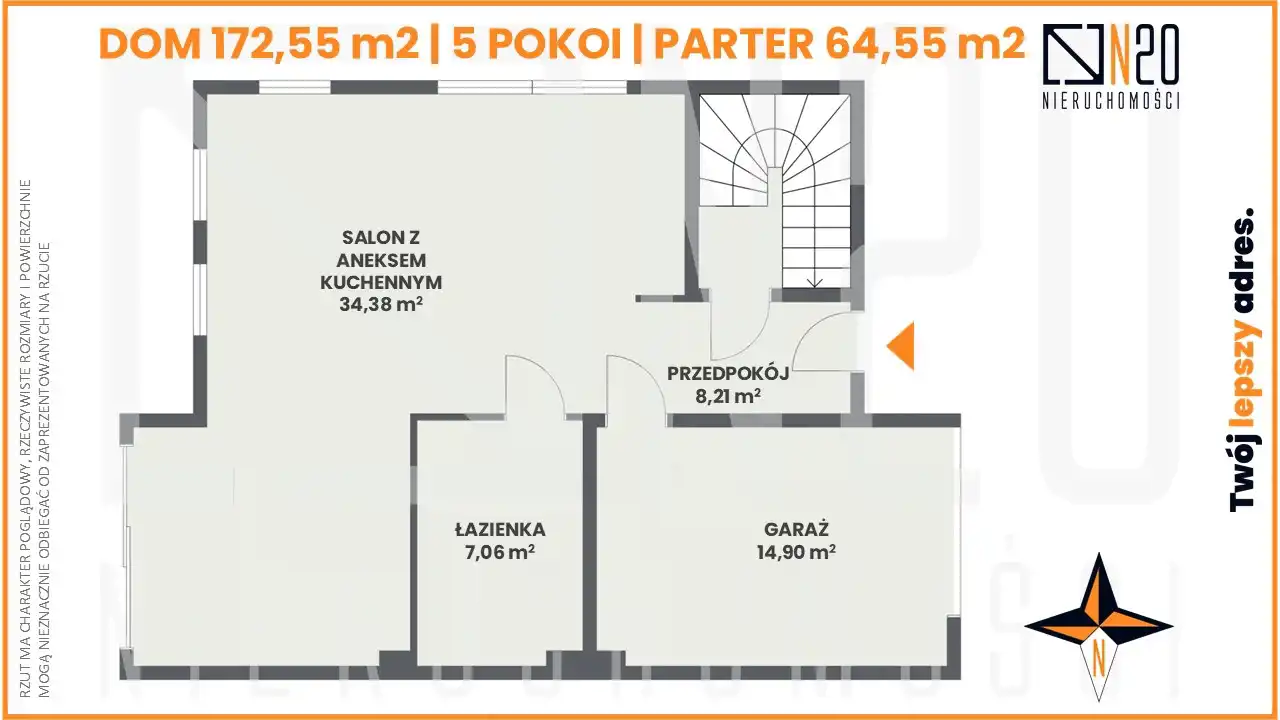 - Parter: jasny i przestronny salon z jadalnią oraz aneksem kuchennym, duża łazienka, funkcjonalny hol oraz garaż jednostanowiskowy