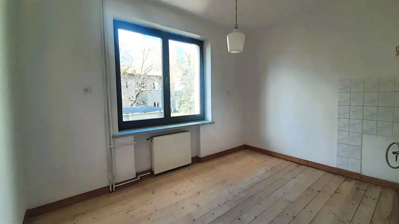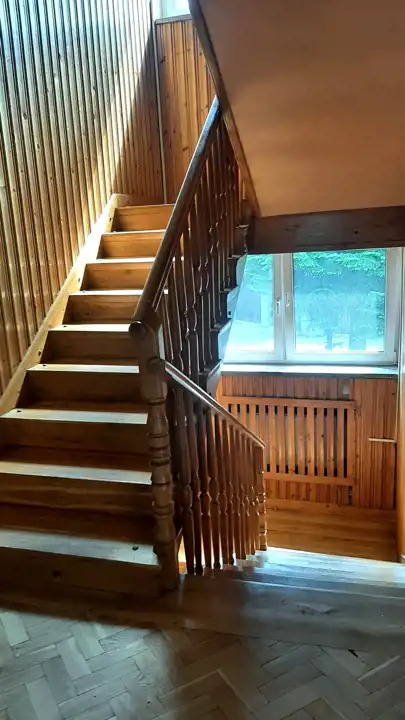 Podłogi: w pokojach – parkiet, pozostałe pomieszczenia -gres. Drzwi zewnętrzne i okna drewniane, schody na piętro drewniane.