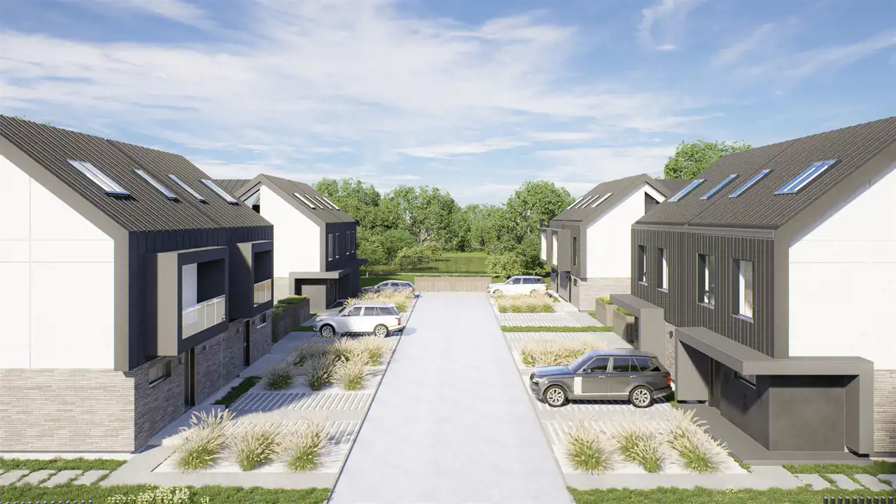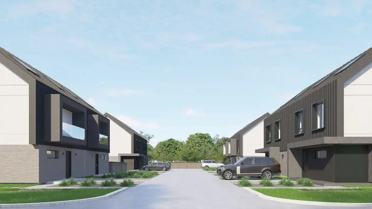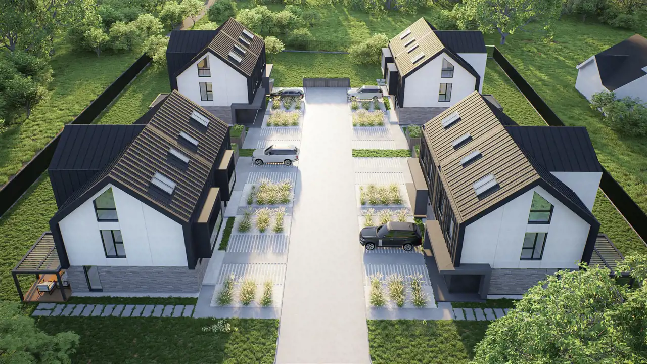 Budynek oparty na nowoczesnej architekturze z przynależnymi dwoma miejscami postojowymi, czterema sypialniami, gabinetem ulokowanym na poddaszu oraz dwiema łazienkami.