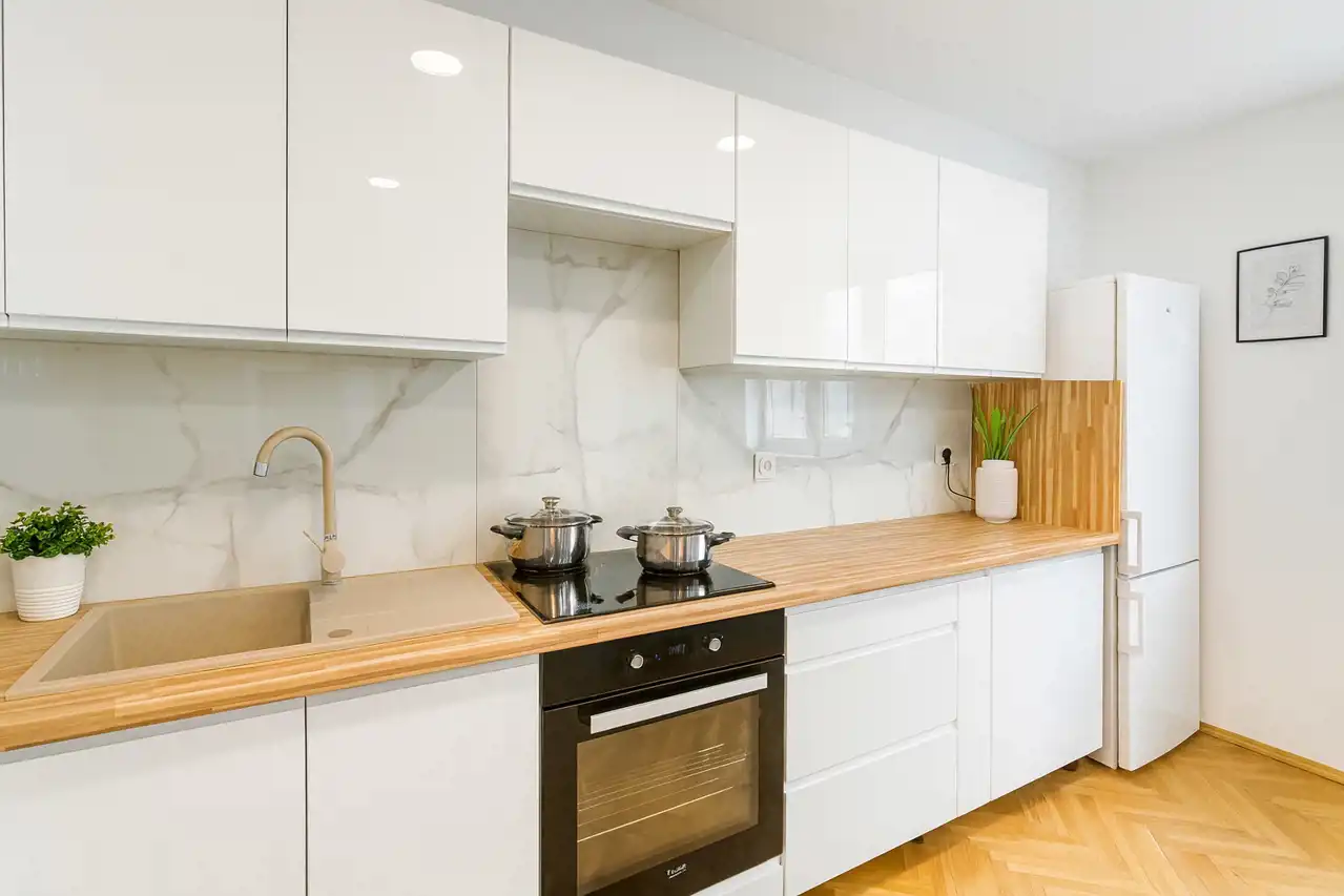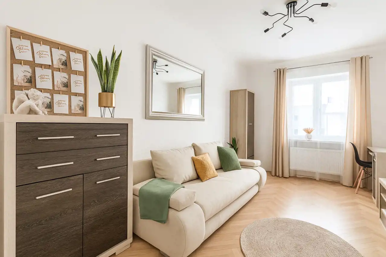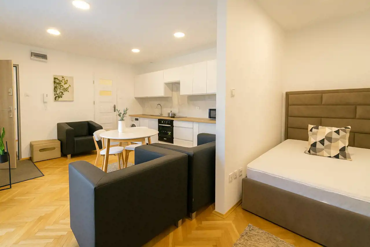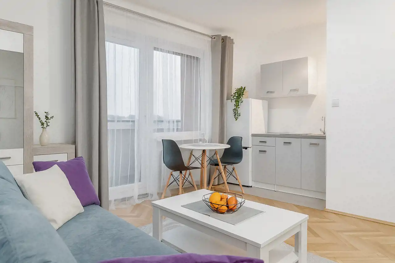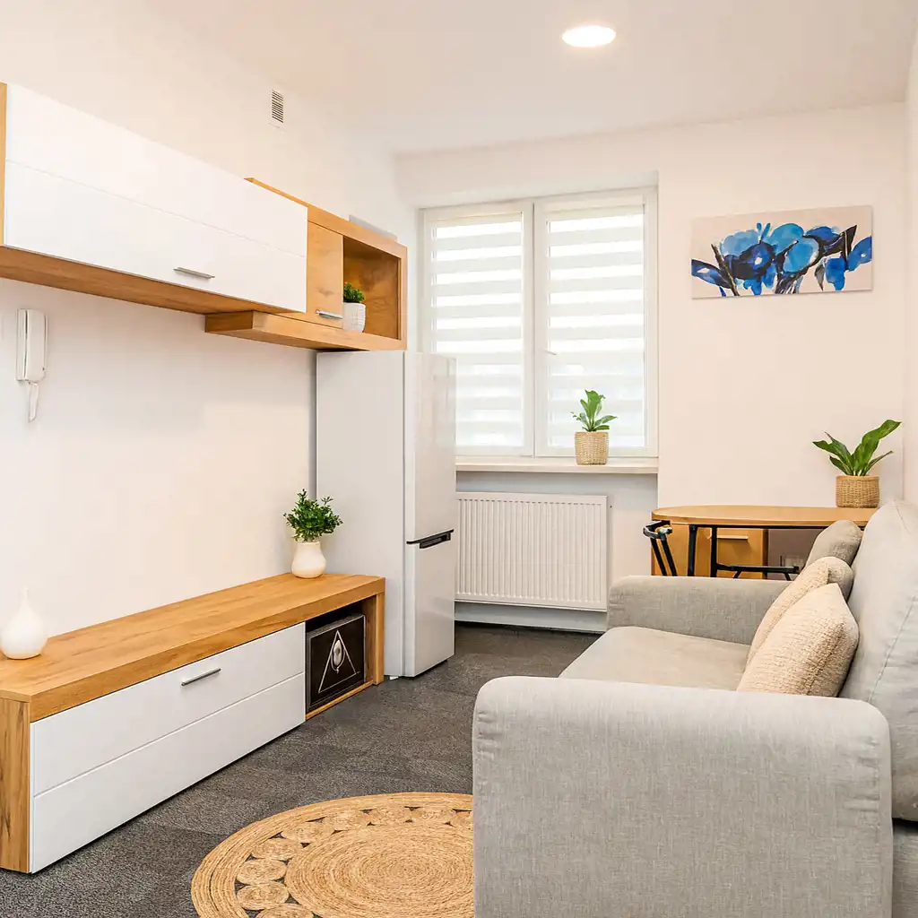 Budynek został funkcjonalnie podzielony na 5 niezależnych kawalerek o powierzchni od 20 do 25 m². Każde mieszkanie jest w pełni samodzielne i wyposażone w: