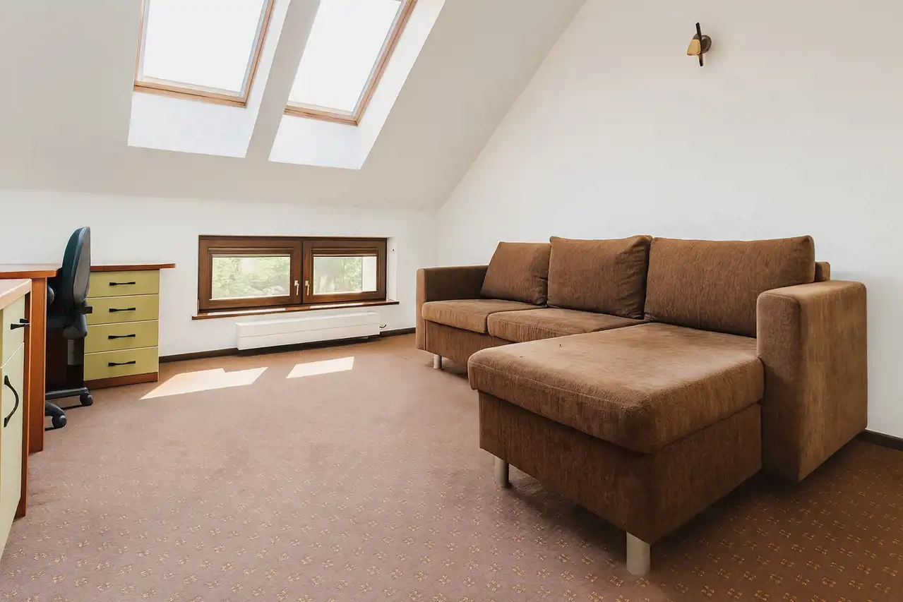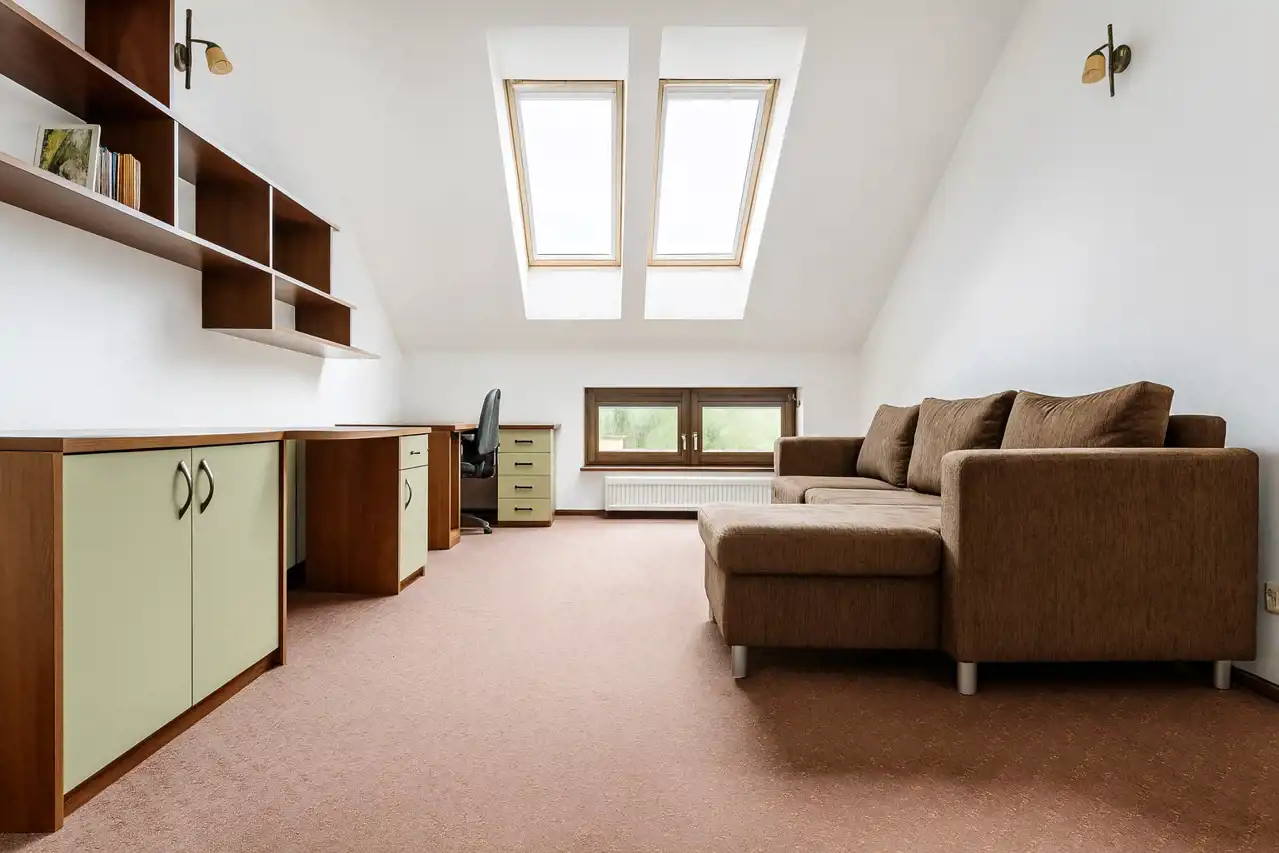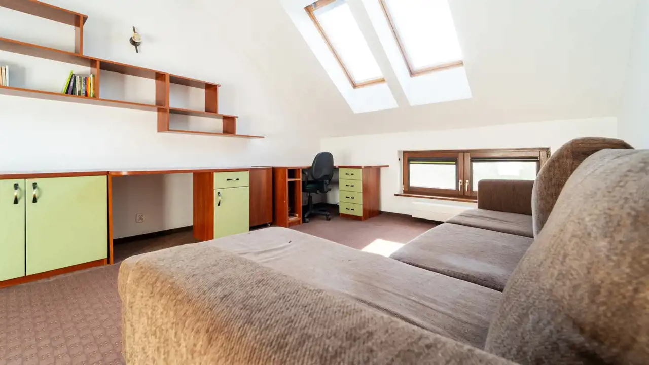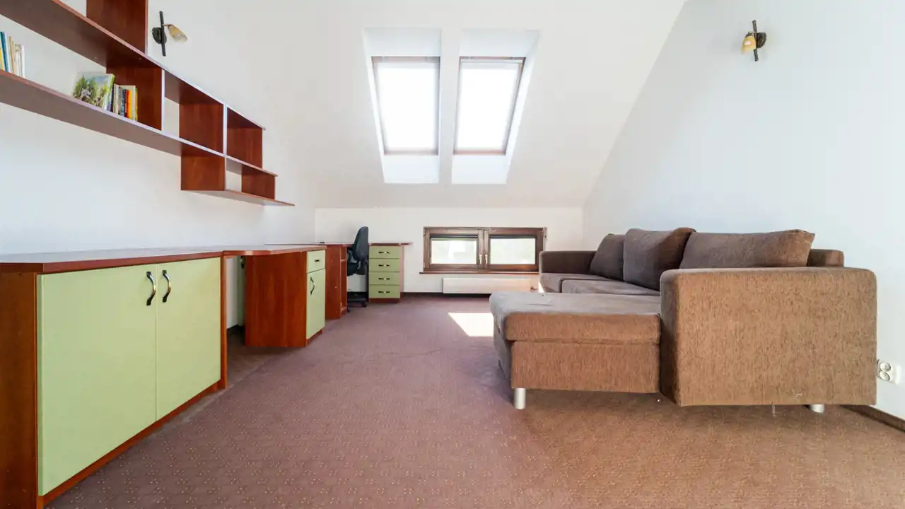 Działka na 3,32 ar więc jest idealna dla osób, które chcą cieszyć się ogródkiem, lecz nie chcą poświęcać dużo czasu na jego pielęgnację. Ogród jest od strony południowej, tak jak balkon jednego z górnych pokoi. Dom jest w bardzo dobrym stanie, ma metraż 208,29 m2. Na poziomie pierwszym znajduje się hol z bardzo dużą szafą, toaleta, kuchnia, przejściowa jadalnia i salon. Na drugim poziomie: cztery pokoje, łazienka z toaletą, hol i wyjście na poddasze. Poddasze jest ocieplone, ze skosami mierzy 70m2, do wysokości 220cm - ok.50 m2. Powierzchnia poddasza nie jest wliczona w podane 208,29 m2.
