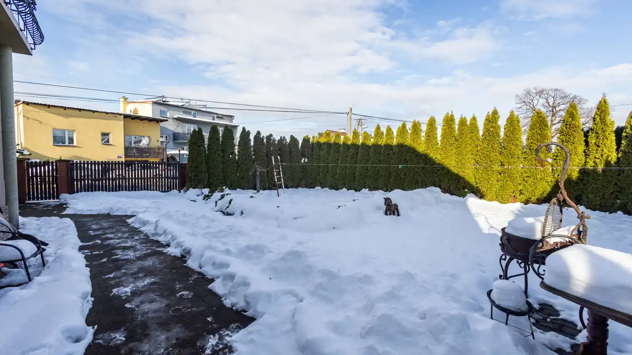 Dom jest położony na ładnie zagospodarowanej działce o powierzchni 914 m2. Do domu prowadzą dwie niezależne bramy wjazdowe na pilota, z możliwością parkowania na terenie posesji. Podjazdy pokryte są kostką brukową.