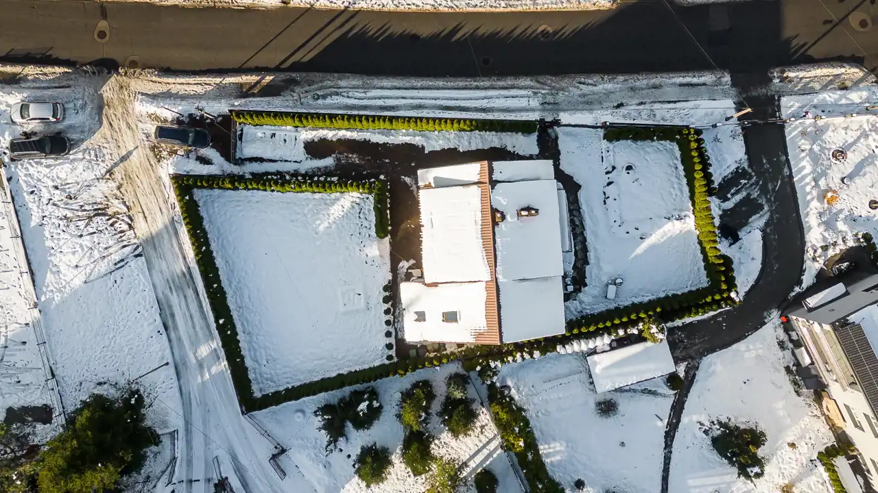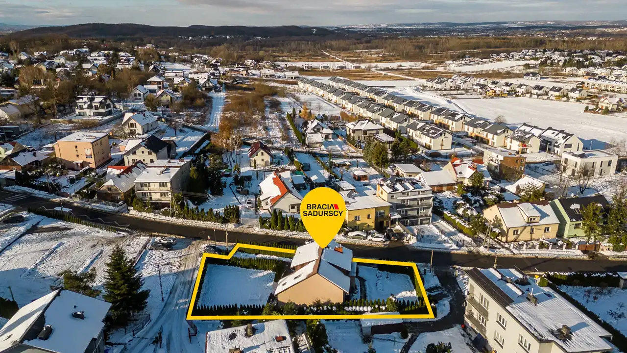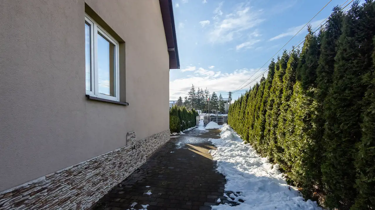 Dom jest położony na ładnie zagospodarowanej działce o powierzchni 914 m2. Do domu prowadzą dwie niezależne bramy wjazdowe na pilota, z możliwością parkowania na terenie posesji. Podjazdy pokryte są kostką brukową.