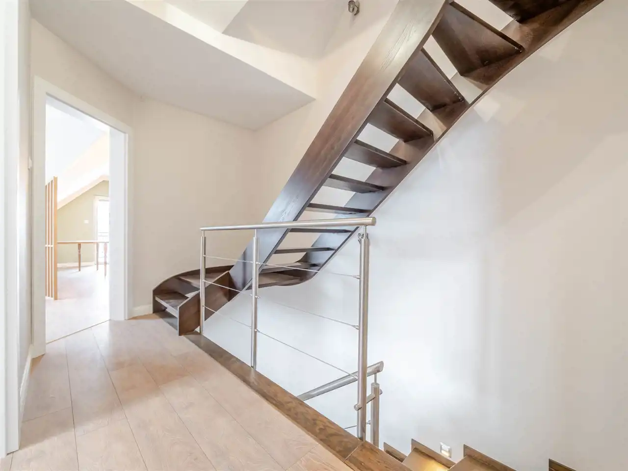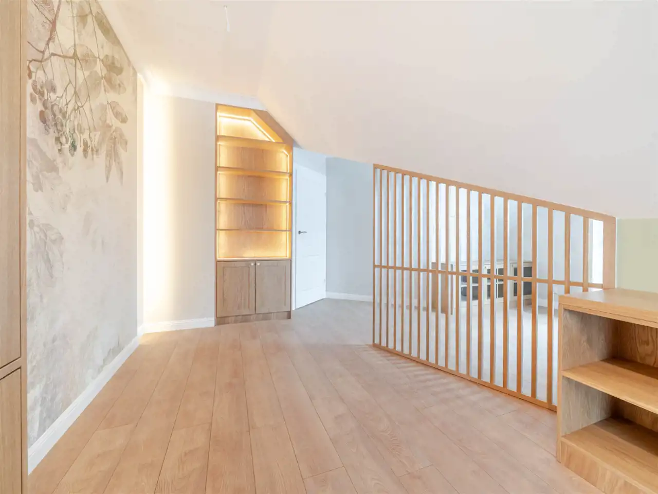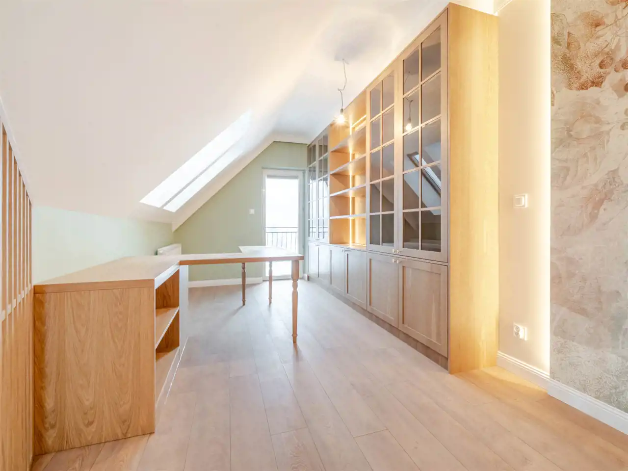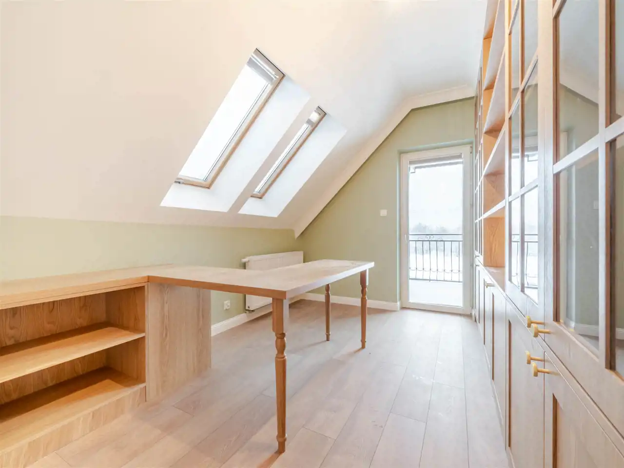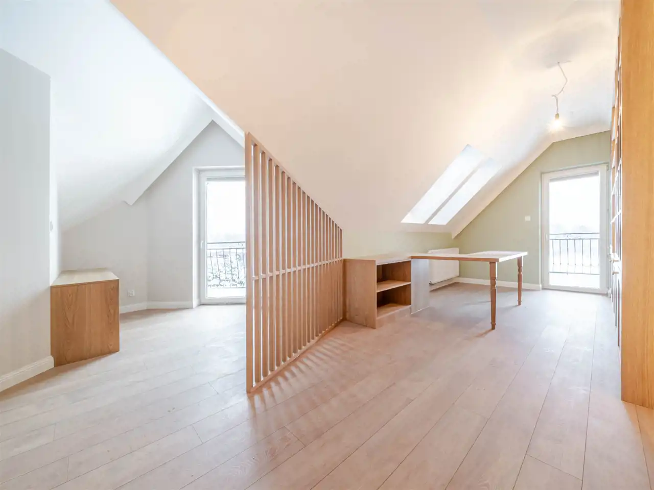 Poziom poddasza zawiera 3 pokoje (25,11m2; 11,99 m2; 19,16 m2), w tym dwa pokoje z balkonami, łazienkę (9,01m2) i komunikację. Dodatkowa antresola na poddaszu o pow. po podłodze ok. 25 m2.