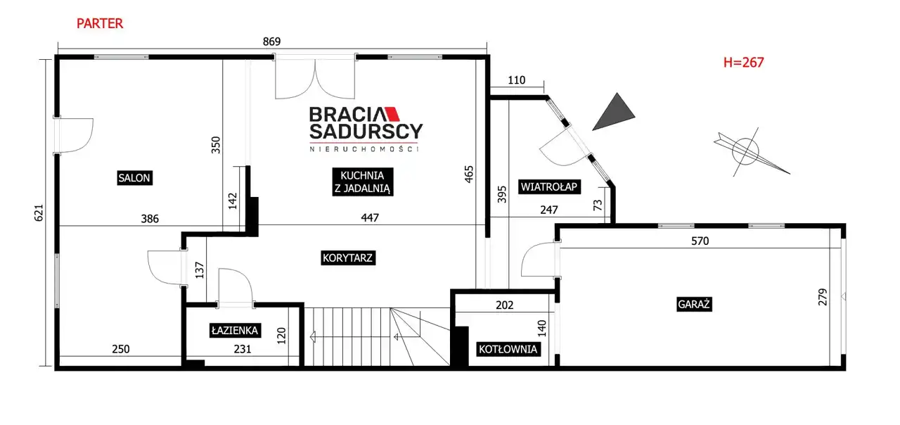 Poziom parteru zawiera: otwartą przestrzeń salonu połączonego z aneksem kuchennym, z wyjściem na taras i do ogrodu, o łącznej powierzchni 36,48 m2 z projektem wydzielenia osobnego pokoju (8,03 m2), łazienkę (2,72 m2), kotłownię (2,55 m2), komunikację i garaż 1 -stanowiskowy (15,90 m2).
