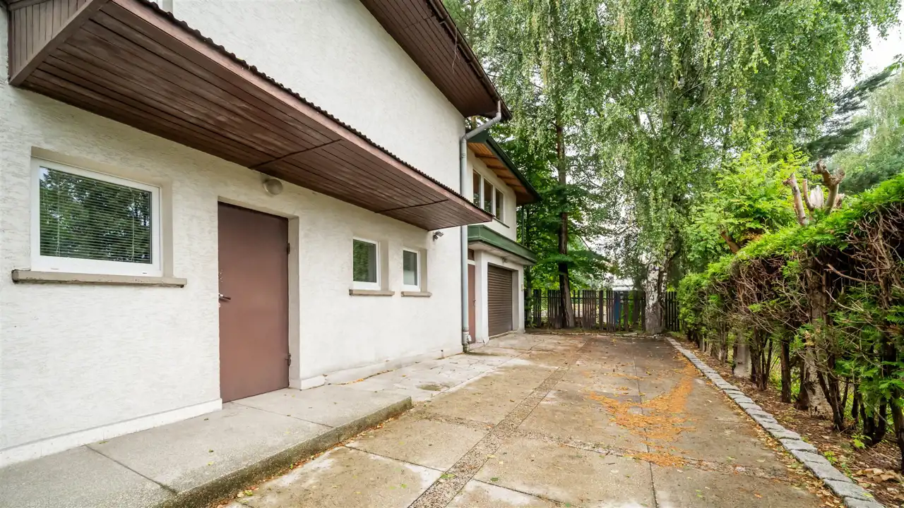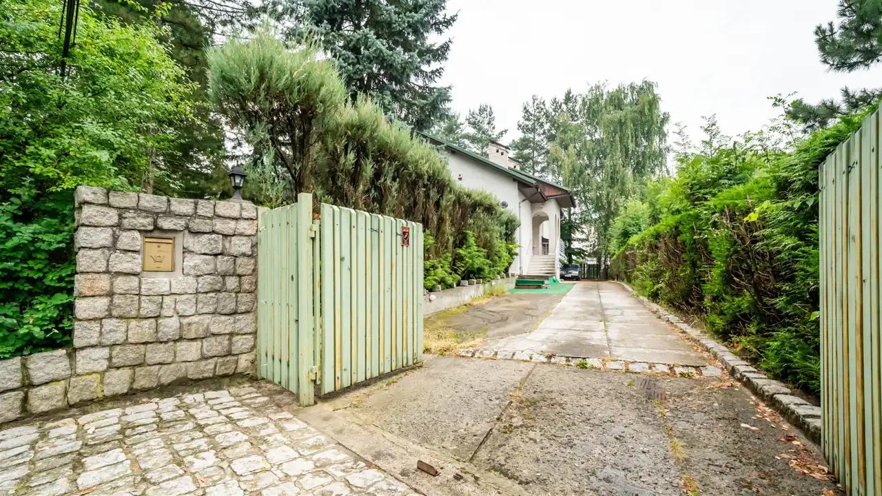 Na posesję prowadzą dwie bramy wjazdowe, umożliwiające niezależny dostęp z dwóch stron działki. Takie rozwiązanie sprawdzi się szczególnie w przypadku podziału domu na strefę mieszkalną i usługową.