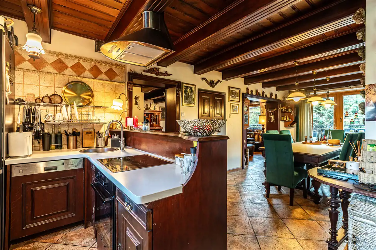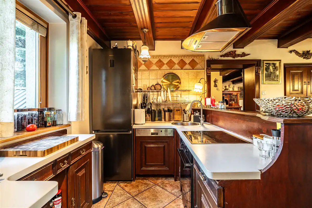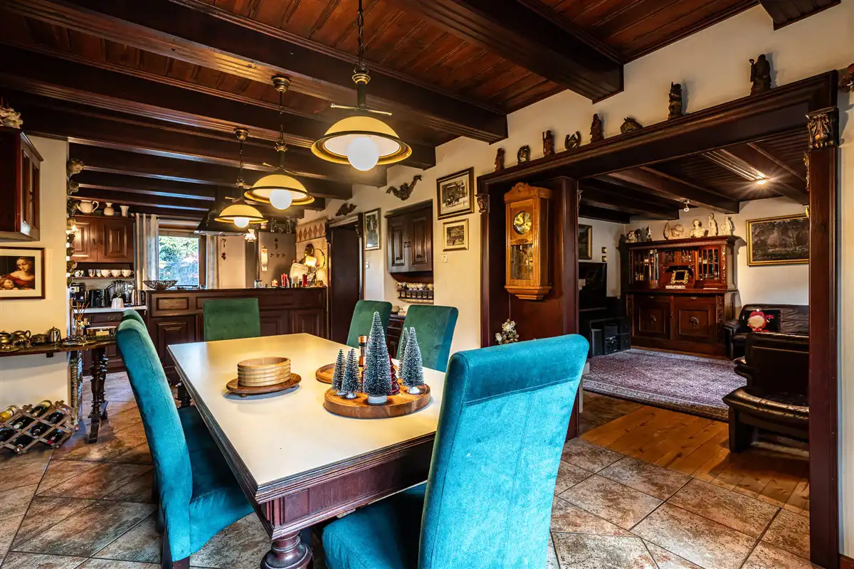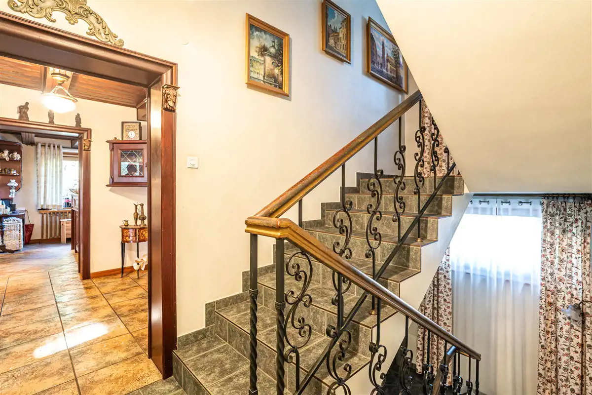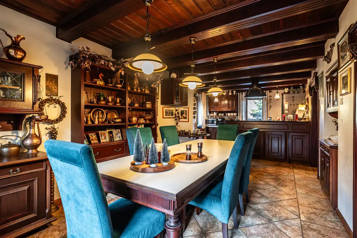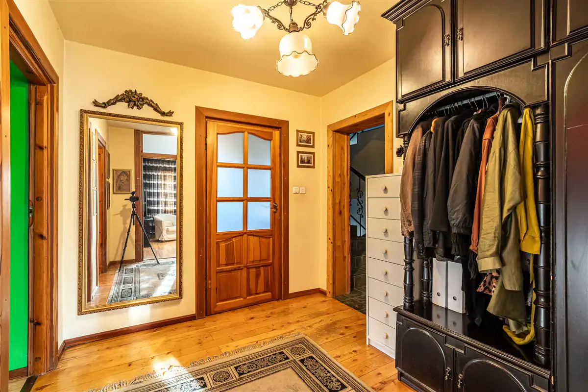 Dom o powierzchni użytkowej 260,82 m2. Budynek jest gotowy do wejścia i wykończony w wysokim standardzie. Dom jest wykonany z pustaka skawińskiego i cegły oraz ocieplony (steropian-10cm). Dodatkowo ocieplony strych. Okna drewniane nowego typu. Dach jest z fińskiej blachy. Dom ogrzewany jest piecem dwufunkcyjnym gazowym. Podłoga jest z deski dębowej. Kuchnia jest wyposażona w: lodówkę, zmywarkę, płytę indukcyjną i piekarnik.