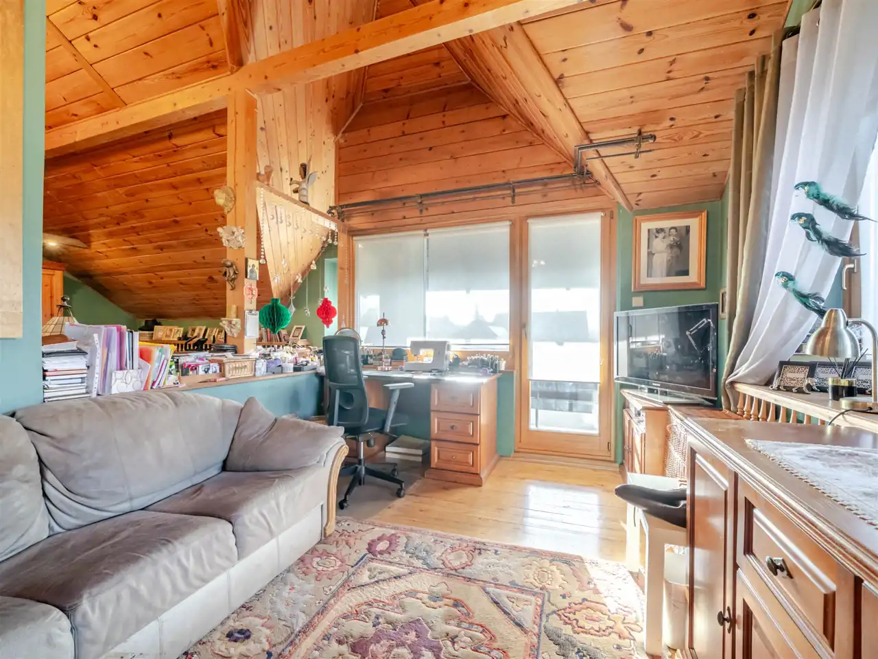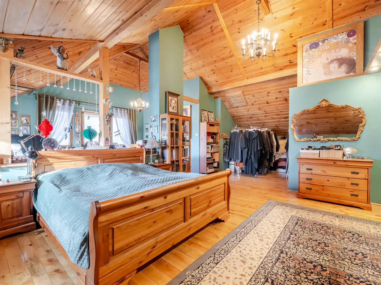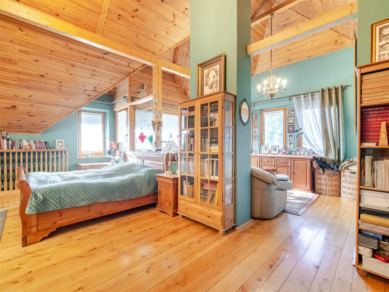 Miłośnikom otwartych przestrzeni powinno spodobać się poddasze z pięknie wykończonym w drewnie sufitem, podobnie podłogę cechuje naturalny materiał jakim jest drewno.