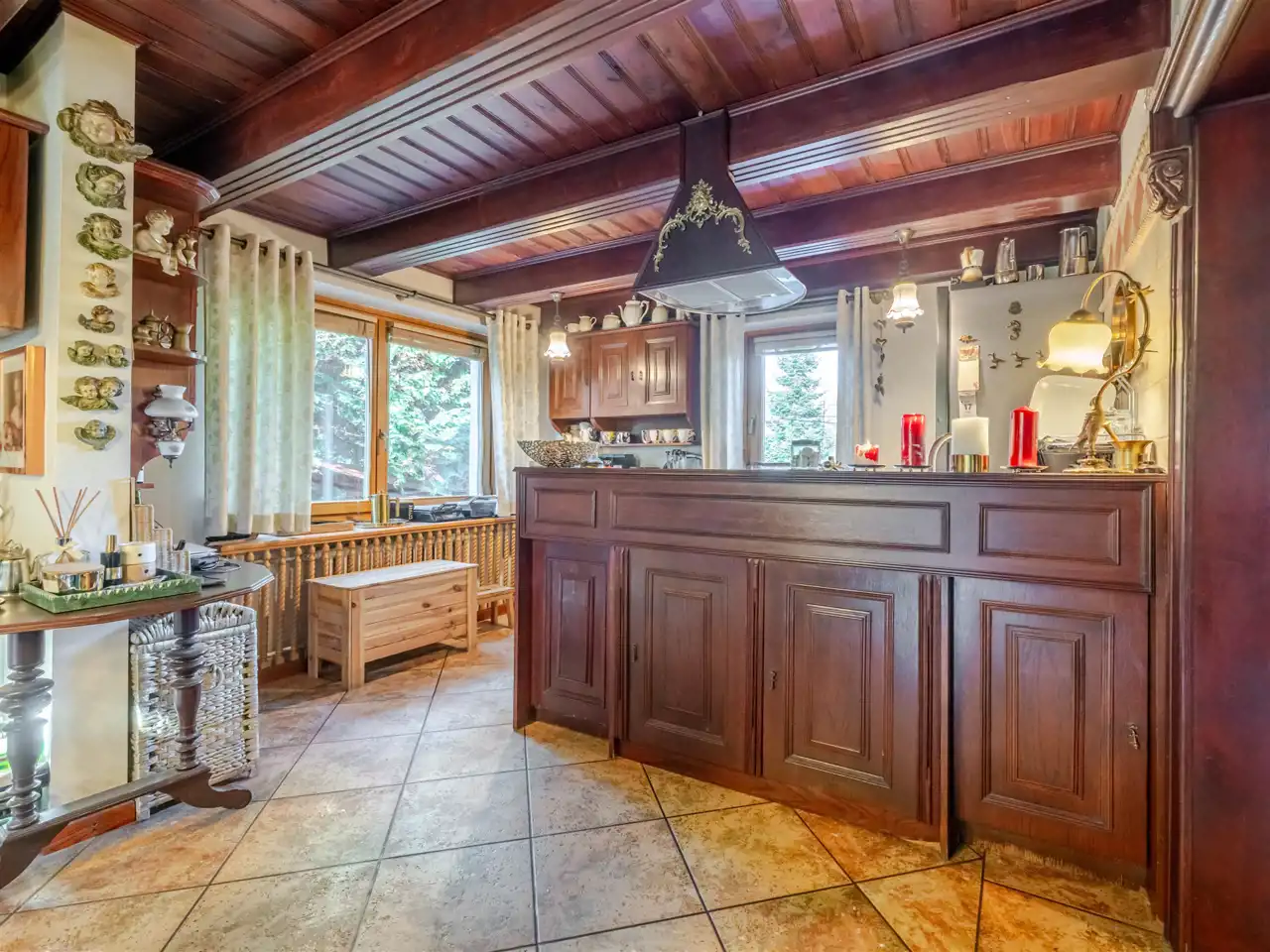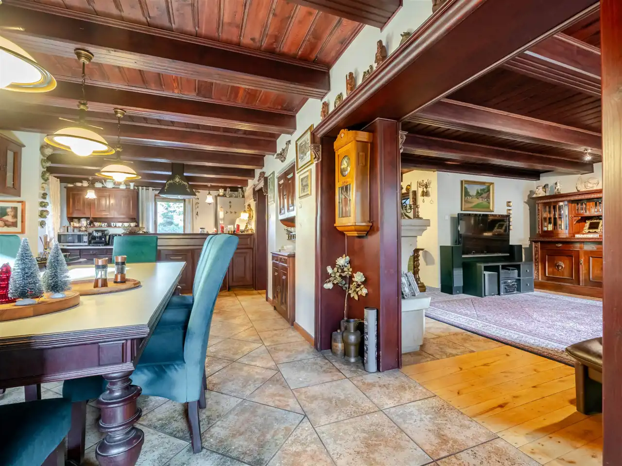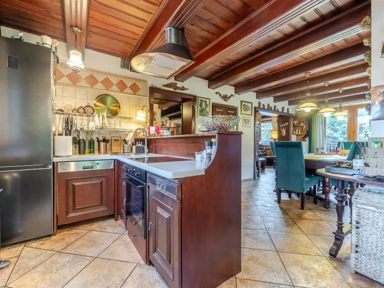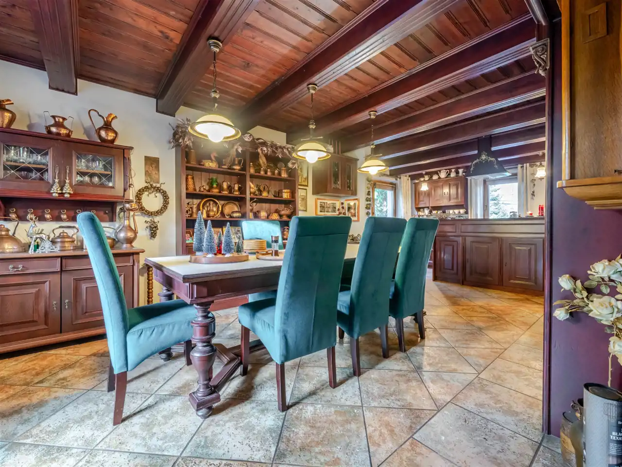 W salonie, jadalni i kuchni na uwagę zasługuje modrzewiowe zwieńczenie sufitu, podkreślające wyjątkowy charakter pomieszczeń.