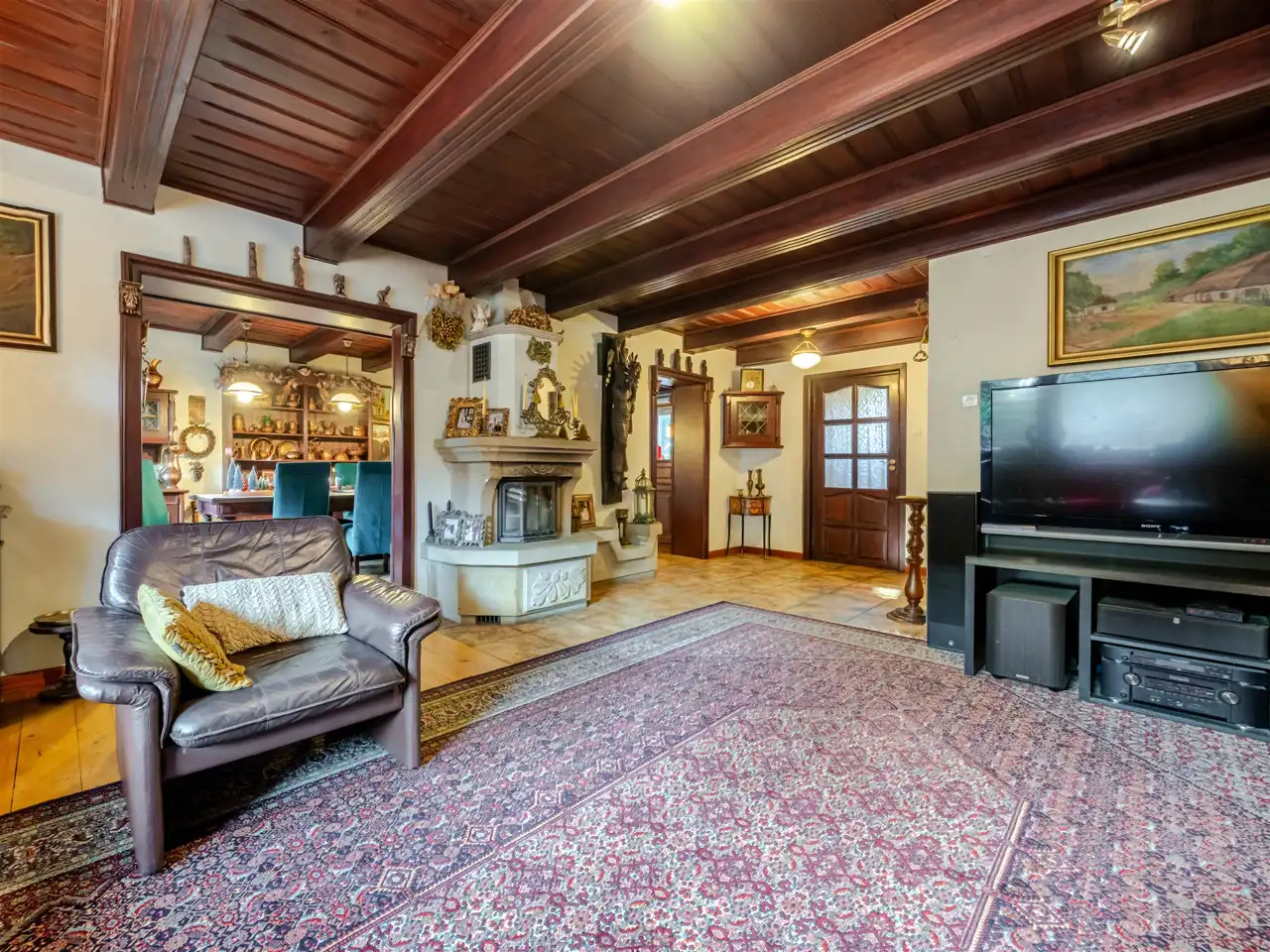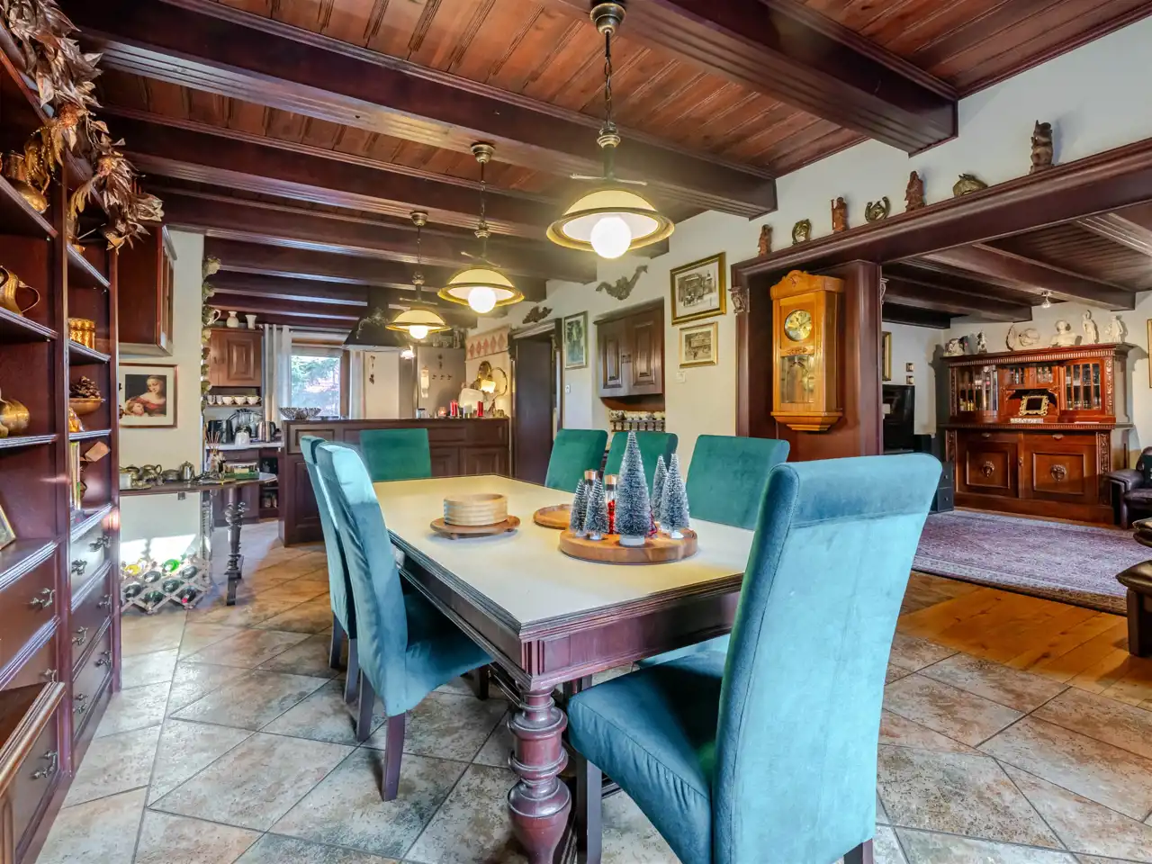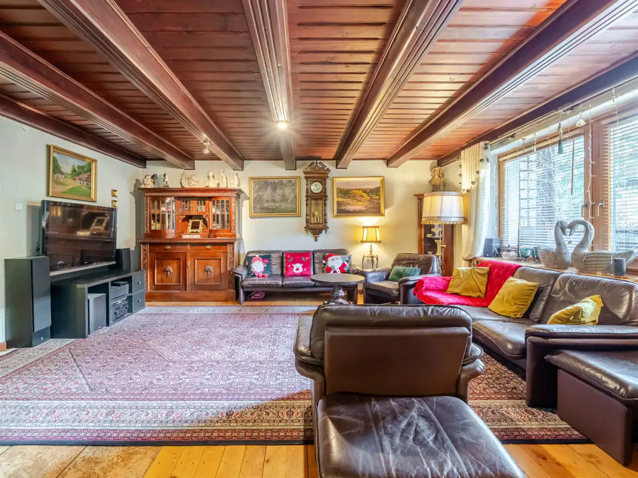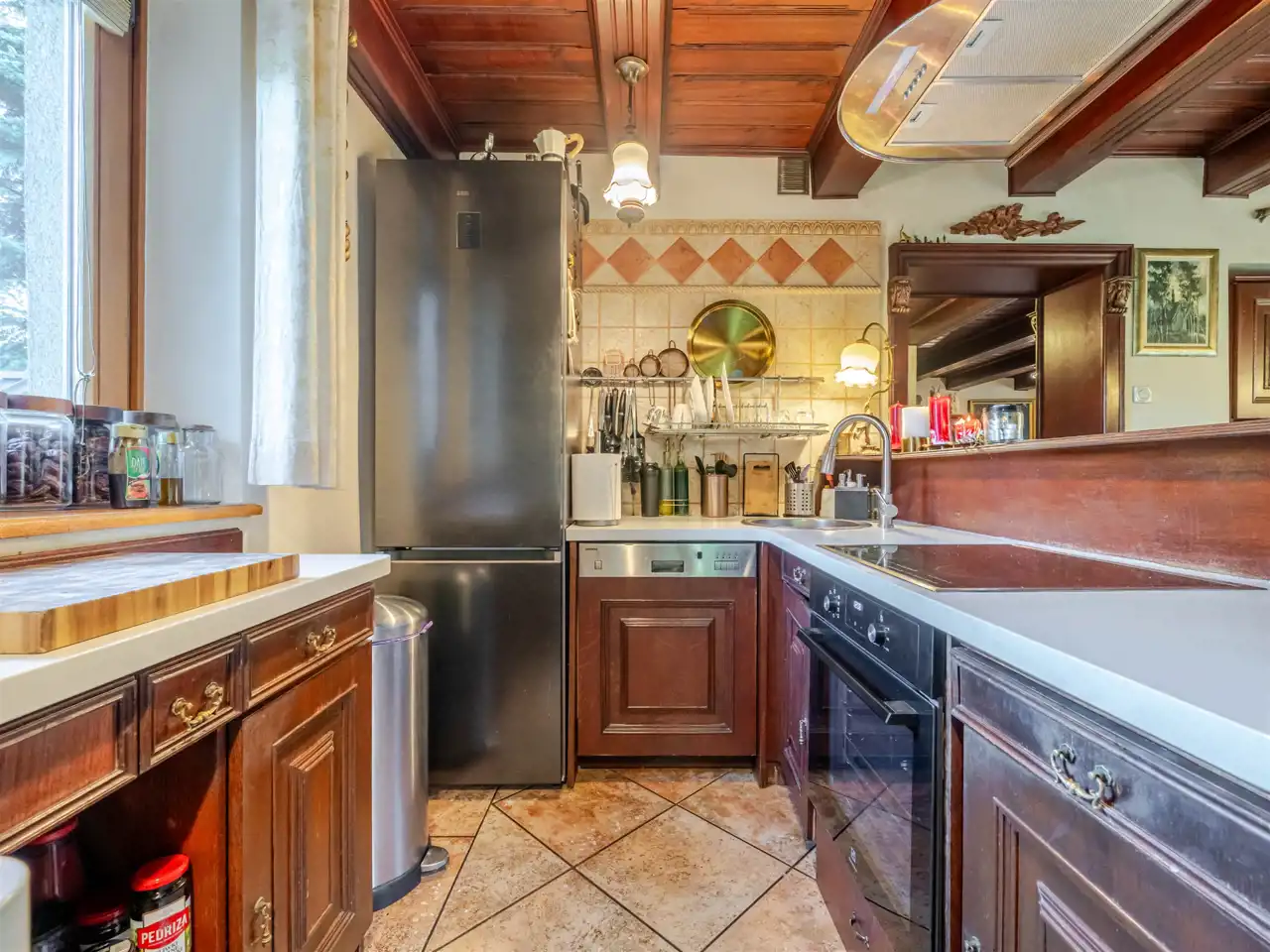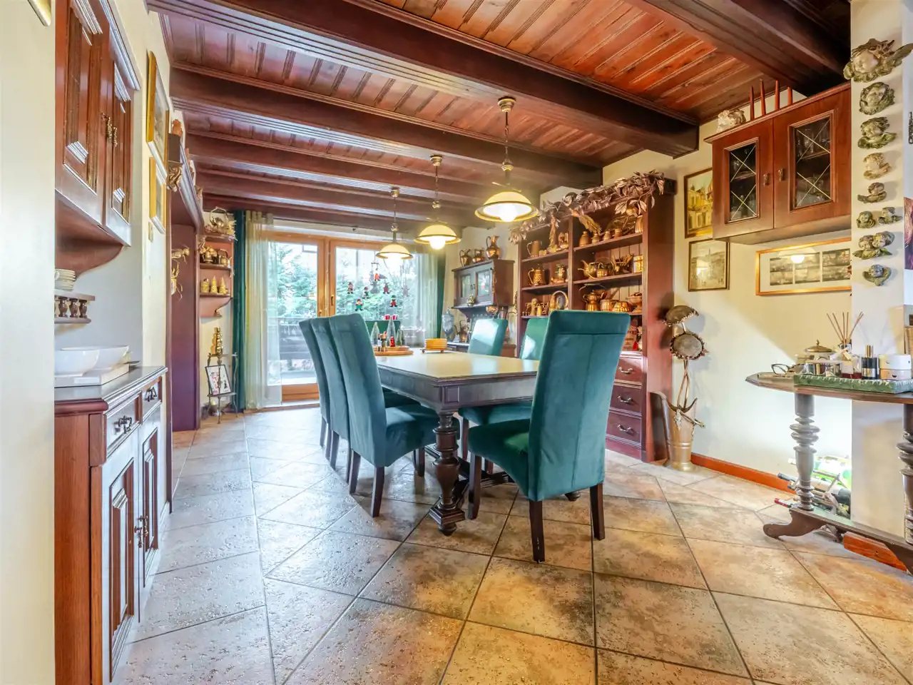 W salonie, jadalni i kuchni na uwagę zasługuje modrzewiowe zwieńczenie sufitu, podkreślające wyjątkowy charakter pomieszczeń.