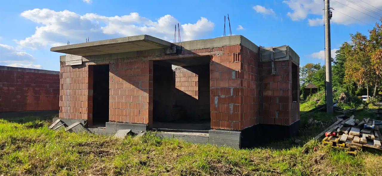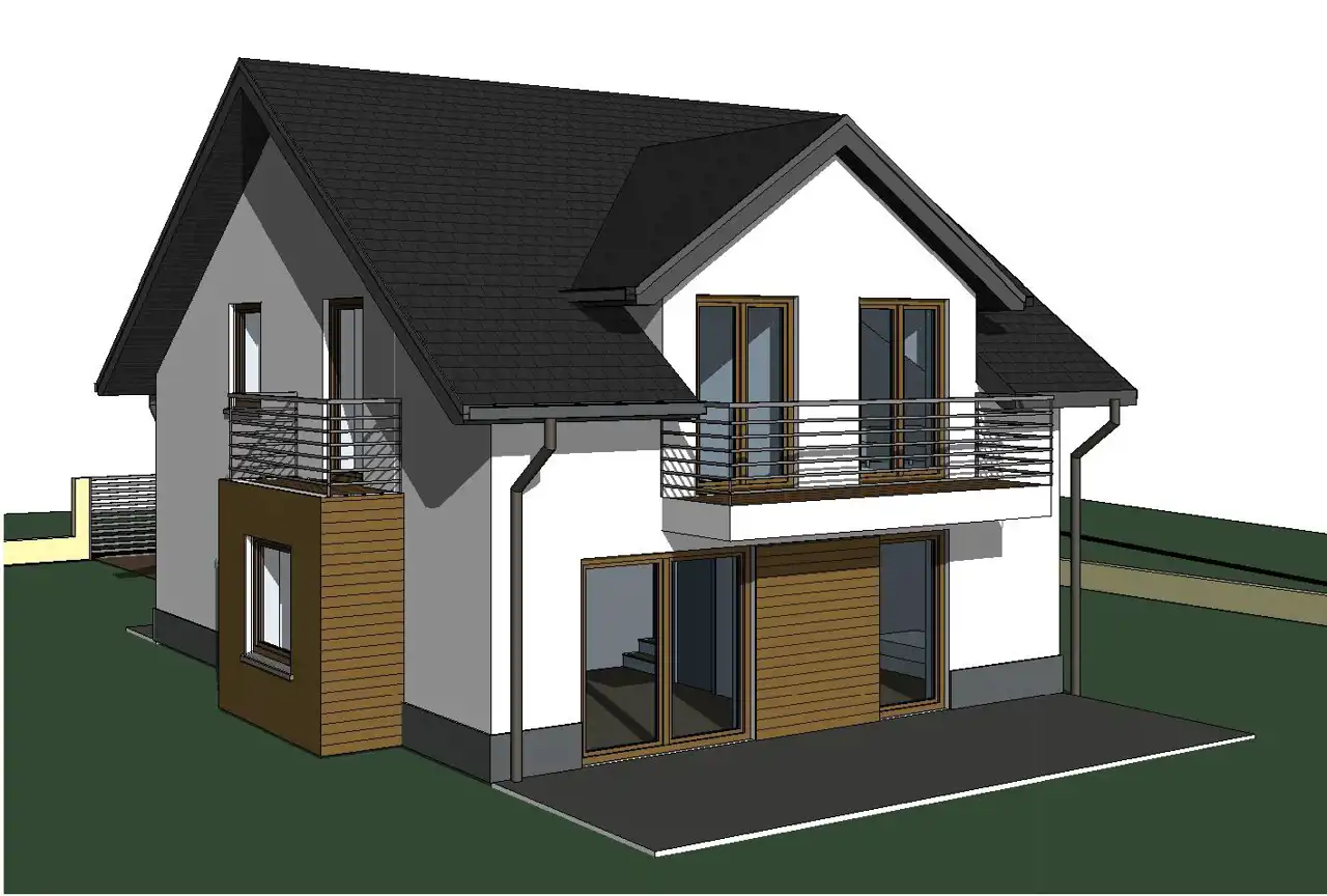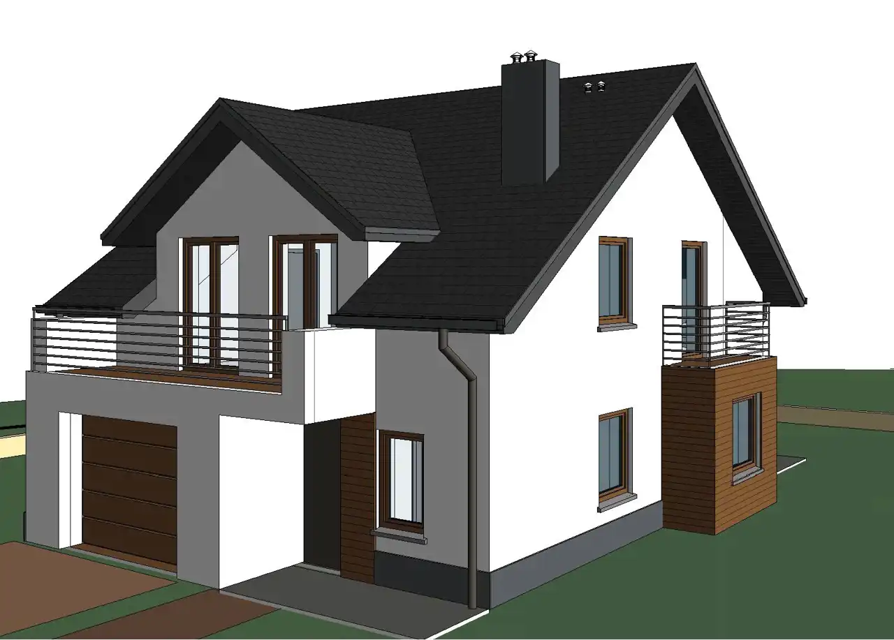 The house was designed based on the “Bella” project by Studio Krajobrazy. It is situated on a rectangular, well‑sunlit plot. Usable floor area: 114.29 m² + garage 25.71 m² Total floor area: 146.25 m², including structural elements (walls, chimneys, balconies). At this stage, modifications to internal partition walls are possible. An easement for access to the plot has been established.